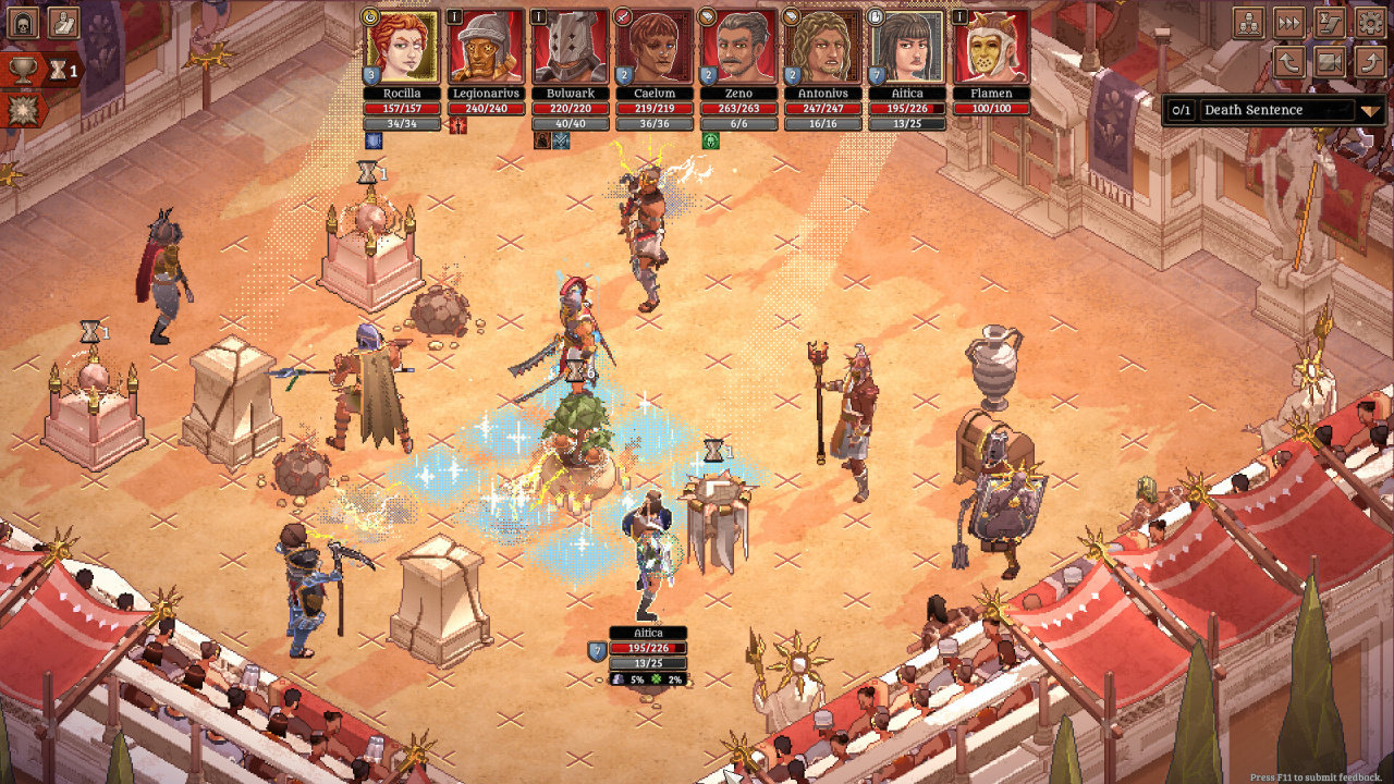 За пределами арены геймплей концентрируется на управлении прибрежным городом Маревенто. Между битвами необходимо вкладывать заработанное золото в строительство и улучшение зданий. Лазарет позволяет восстанавливать раненых, рынок — торговать снаряжением, а особые постройки открывают доступ к новым механикам. Можно заключать сделки с криминальными авторитетами для саботажа противников или совершать подношения богам, надеясь на их божественное вмешательство в грядущих схватках. Подготовка отряда, включающая тренировки и экипировку, является ключевым элементом на пути к свержению императора.