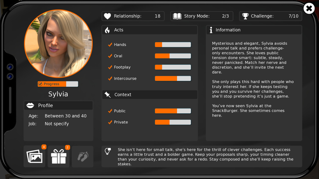 SeductVille — визуальный роман, где концепция проигрыша или неверного шага полностью отсутствует. Под управление геймера попадает мужской персонаж, погружающийся в мир, построенный на искусстве соблазнения и исследовании собственных желаний в одноименном городе. Этот проект предлагает полную свободу действий в рамках песочницы, позволяя без ограничений выстраивать интимные связи с интригующими девушками. Каждое знакомство открывает новые возможности для откровенного взаимодействия, а все пикантные сцены выполнены в качественной трехмерной анимации, что усиливает эффект погружения в происходящее.