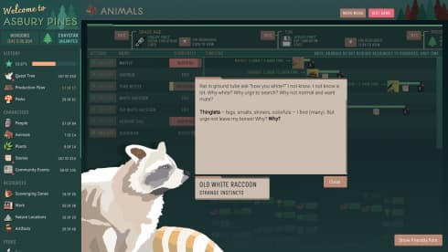 Asbury Pines — это нарративный инкрементальный тайтл, где для раскрытия тайны жестокого убийства необходимо выстроить производственные циклы, охватывающие всю историю городка. В основу геймплея положен синтез усилий более 50 уникальных существ, артефактов и даже растений. Объединение труда таких непохожих личностей, как пещерный человек Хрокк и физик-темпоралист Мохаран, позволяет создавать и модифицировать сложный механизм по добыче ресурсов. Эффективность этой системы напрямую влияет на скорость получения доступа к новым фрагментам повествования, постепенно проливающим свет на мрачную загадку. Развитие автоматизированных производственных петель между прошлым и будущим становится главным инструментом в руках детектива, путешествующего во времени.