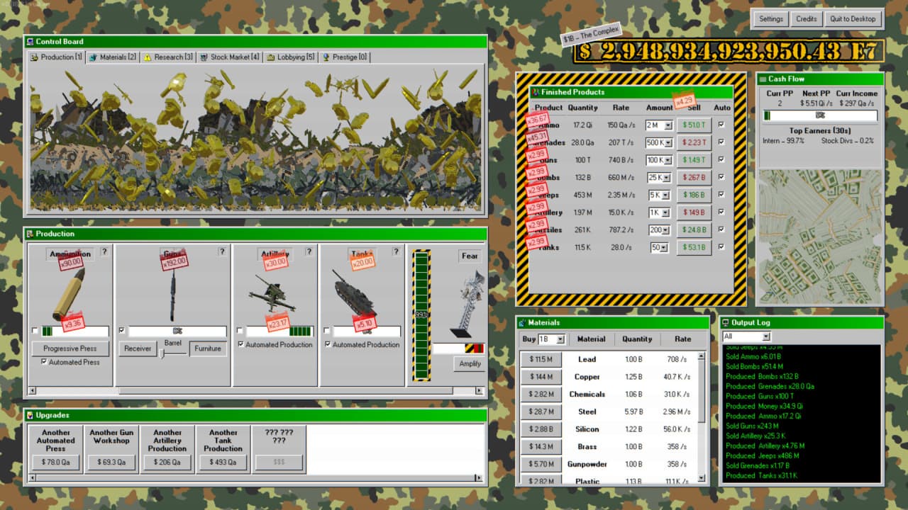 Основой процветания является разветвленная производственная сеть, позволяющая создавать 11 видов вооружений. Ассортимент простирается от танков, самолетов и даже ядерных боеголовок до простых патронов, изготавливаемых вручную на начальных этапах. Игровой процесс в Military Incremental Complex требует постоянной оптимизации производственных процессов. Свыше 120 улучшений в древе исследований направлены на удешевление и ускорение производства, а полный контроль над цепочкой поставок, от шахт до заводов, обеспечивает бесперебойный поток ресурсов и автоматизацию всех операций.