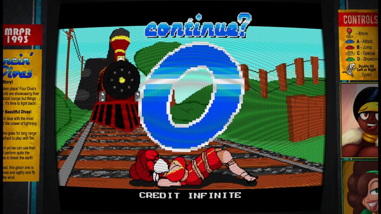 Сюжетная завязка отправляет певиц в погоню за злодеем по имени Ван Бад и его приспешниками, укравшими ценности прямо во время выступления. Геймплей Dancin Divas отсылает к золотой эре аркадных автоматов, наследуя механики Streets of Rage и Final Fight. Помимо уникальных приемов, героини могут использовать в бою разнообразное оружие, включая бомбы и огнестрельные образцы, а также бросаться в противников предметами окружения. Накопив достаточно энергии, каждая дива способна активировать ультимативную атаку Showtime, наносящую урон всем врагам на экране.