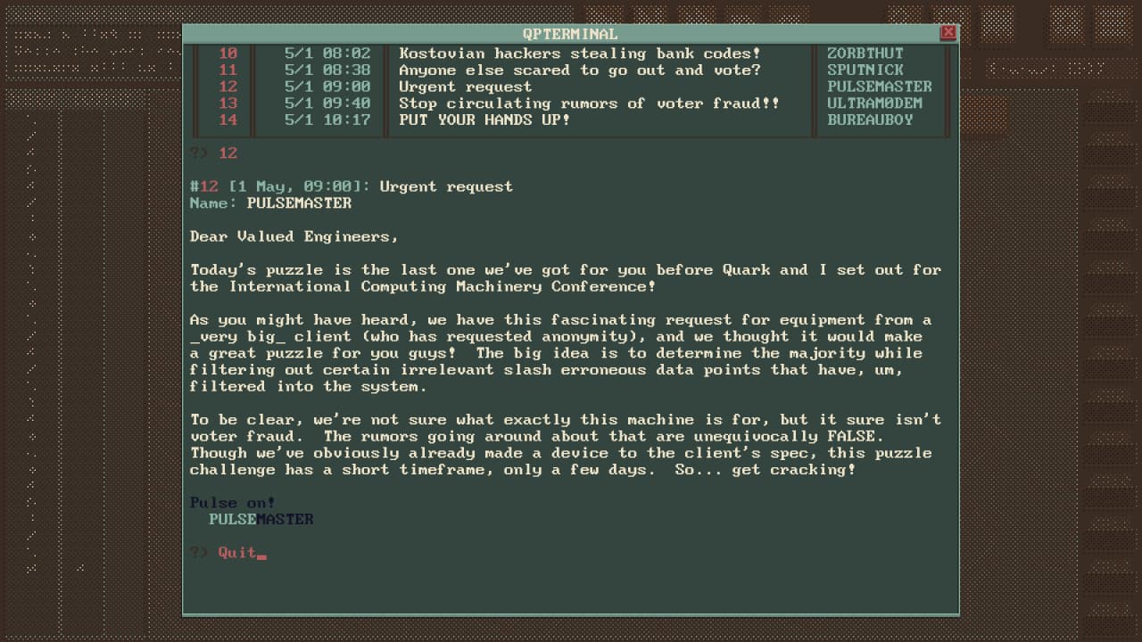 QuantumPulse 2A v Build 19898936 Новая версия Полная версия Последняя Дата выхода 25 авг. 2025 Разработчик Dashing Strike Жанр Симуляторы, Инди Положительные на основе 26 обзоров в Steam 96% Обновлено 13 сентября 2025, 10:52 Список изменений В QuantumPulse 2A предстоит решать головоломки по программированию на вымышленном компьютере 1977 года. Геймплей построен на использовании уникального языка ассемблера с особыми ограничениями и системой связи по радиоканалам. Обучающий раздел помогает освоиться в среде разработки. Все 25 заданий имеют двойную цель: сначала необходимо создать работающий код, а затем следует более сложный процесс его улучшения для достижения пиковой производительности и эффективности. Состязательная часть игры QuantumPulse 2A завязана на таблицах лидеров, оценивающих качество оптимизации для каждого испытания. После выполнения задания успешность кода определяется по трем разным параметрам: времени выполнения, количеству строк и суммарной стоимости использованных аппаратных частей. Эти результаты формируют рейтинг, позволяющий сравнить свои достижения с показателями друзей или всего мирового сообщества. Для каждого уровня существуют отдельные списки лучших по этим категориям производительности. Продвижение вперед открывает доступ к следующим испытаниям и новому оборудованию. Выполнение головоломки делает доступными новые этапы и 7 различных типов микросхем для интеграции в будущие сборки. Чтобы обеспечить честные условия, каждый игрок приступает к заданию с одинаковым набором доступных инструментов, независимо от личного прогресса. Игровой процесс представлен в виде истории о специалисте, работающем на машине QP-2A и проходящем курс сертификации, что подается через маркетинговые материалы той эпохи. Скачать торрент Скриншоты Показать больше Видео из игры Скачать QuantumPulse 2A Тип релиза Пиратка (Таблетка: Не требуется) Версия v Build 19898936 (Полная) Последняя Размер 93.06 МБ Интерфейс Английский Озвучка Отсутствует Установка: Скачать .torrent торрент файл Скачать БЕЗ торрента прямая ссылка через uTorria Альтернативные раздачи Прямые ссылки Облачные хранилища v Build 19898936 113 МБ Показать Системные требования ОС: Windows 10 (64-bit) Процессор: Intel Core2 Duo Оперативная память: 1 ГБ Видеокарта: 1 ГБ Место на диске: 300 МБ Программирование, Головоломка, Логика, Сложная, Хакерство, Ретро, 80-е, Война, Игры в 2D, Альтернативная история, Минимализм, Пиксельная графика