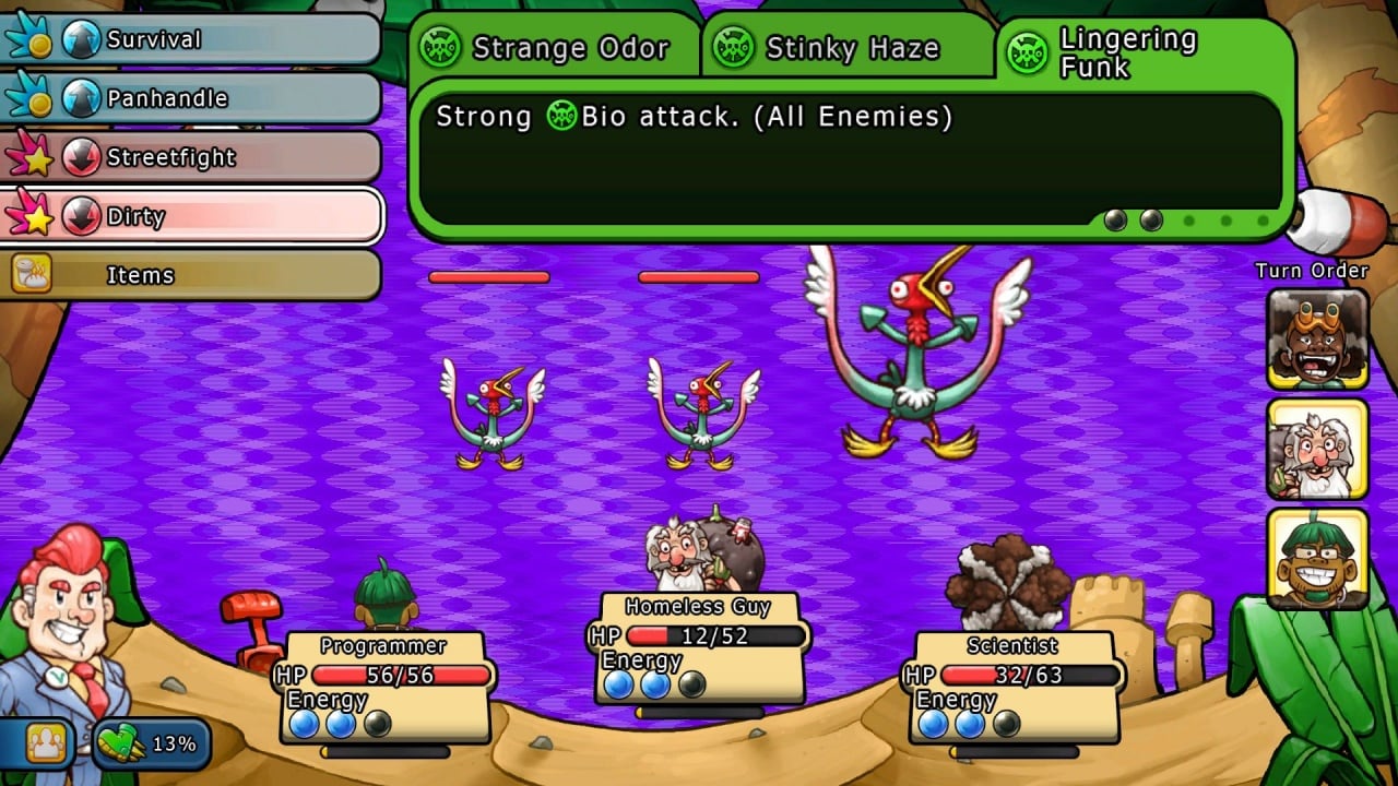 Структурно это традиционная ролевая территория в японском стиле. Вы бродите по городам, городам, лесам, пляжам и за их пределами, обыскивая дома, разговаривая с местными жителями и участвуя в боях с головорезами и враждебной флорой и фауной, ища новых персонажей, чтобы добавить их в свою команду. Но в соответствии с его темой преувеличения и политиканства, есть десятки таких персонажей, которых можно привлечь к делу: пекари, бариста, учителя, полицейские, механики, пожарные, ИТ-вспомогательный персонал и так далее. Почти у каждого NPC, с которым вы встречаетесь, есть возможность диалога "рекрут", и если вы убедите их присоединиться, каждый может быть включен в вашу боевую команду из трех человек.