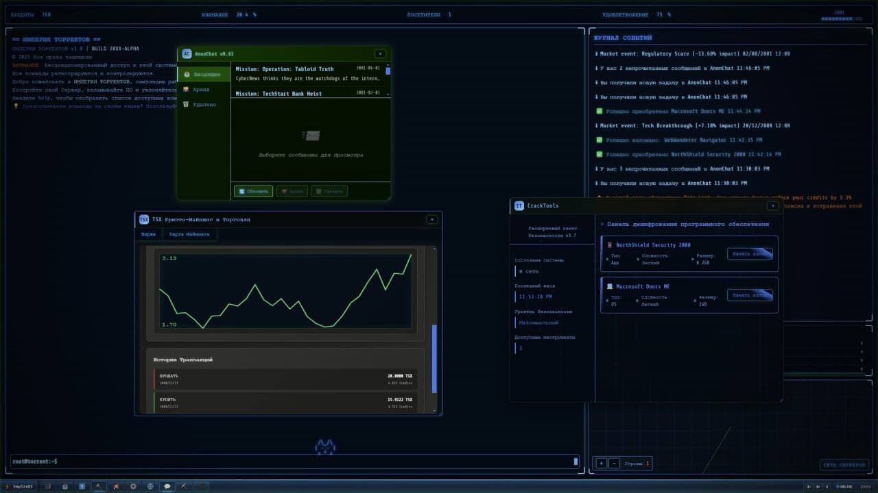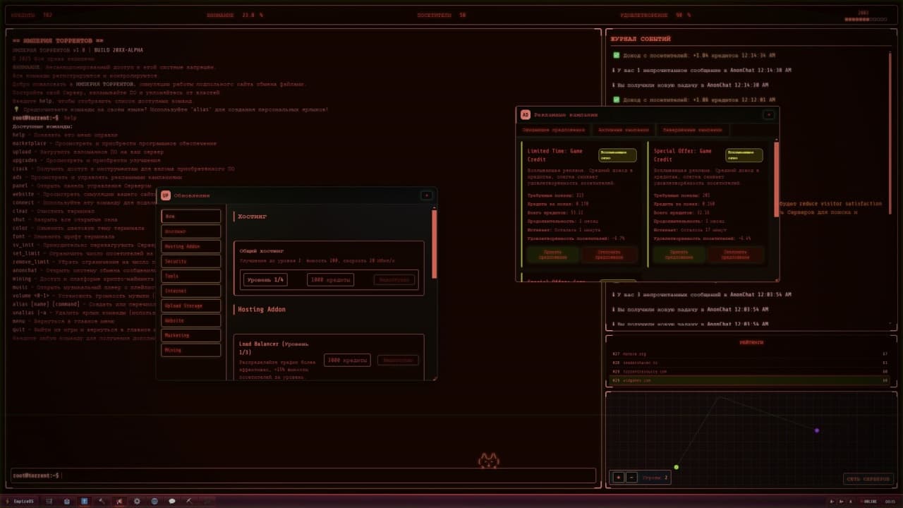 Torrent Empire — это симулятор создания собственной пиратской державы, разворачивающийся в декорациях цифрового подполья эпохи 2000-х годов. Вся деятельность по возведению теневой сети распространения контента представлена в формате стратегического проекта с интерфейсом, имитирующим командную строку терминала. Фундаментом для расширения влияния становятся успешное администрирование серверной инфраструктуры и методичный взлом программного обеспечения. Геймерам предстоит погрузиться в сложную систему правосудия, где каждое действие имеет свои последствия и требует взвешенного подхода к принятию решений. Основная задача заключается в постоянном наращивании мощностей и привлечении новой аудитории для своей подпольной сети.