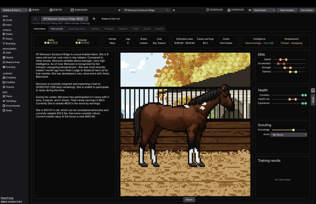 Horse Racing Manager v Build 22868117 Новая версия Ранний Доступ Последняя в альт. раздачах Дата выхода 24 окт. 2025 Разработчик Sheep Meadow Road Games Жанр Симуляторы, Гонки, Стратегии, Инди, RPG Очень положительные на основе 138 обзоров в Steam 86% Обновлено 7 октября 2025, 14:18 Список изменений Horse Racing Manager — детальное погружение в мир профессионального конного спорта, где создание гоночной династии начинается с одного амбициозного шага. Вместо простого участия в заездах, здесь перед будущим магнатом ставится задача пройти путь от скромного конюха до владельца самой престижной конюшни в мире. Успех определяется не только скоростью скакунов на ипподроме, но и грамотным стратегическим планированием, охватывающим все аспекты бизнеса. Каждое принятое решение формирует уникальную историю взлета или падения. Центральным элементом геймплея является глубокая система разведения. Используя механику псевдо-ДНК, можно целенаправленно выводить чемпионов, чьи генетические данные определяют не только физические параметры, но и характер. Забота о потенциальных победителях требует комплексного подхода, включая составление индивидуальных программ тренировок и планов питания. Эффективность всех процессов внутри Horse Racing Manager напрямую зависит от собранной команды: от жокеев и ветеринаров до скаутов и менеджеров по логистике, каждый специалист вносит свой вклад в общее дело. Развитие инфраструктуры конюшни путем строительства новых объектов также открывает дополнительные возможности. Финансовая сторона предприятия требует не меньшего внимания. Управление активами, контроль расходов и доходов, а также участие в многоуровневых аукционах для приобретения или продажи лошадей составляют основу экономической модели. Мир вокруг живет своей жизнью: управляемые компьютером конкуренты активно борются за лучший персонал и перспективных скакунов, создавая постоянное напряжение. Неверные управленческие ходы могут быстро привести к банкротству, превращая пиксельную симуляцию в настоящее испытание для тактических навыков. Скачать торрент Скриншоты Показать больше Видео из игры Скачать Horse Racing Manager Ранний доступ Тип релиза Пиратка (Таблетка: Не требуется) Версия v Build 22250614 Размер 305 МБ Интерфейс Английский Озвучка Отсутствует Установка: Примечание Более актуальная версия: v Build 22868117находится в блоке - Альтернативные раздачи. Скачать .torrent торрент файл Скачать БЕЗ торрента прямая ссылка через uTorria Альтернативные раздачи Прямые ссылки Облачные хранилища v Build 22868117 520 МБ Показать Системные требования ОС: Windows 10 (64-bit) Процессор: 2 ГГц Оперативная память: 4 ГБ Видеокарта: OpenGL 3.3 Место на диске: 1 ГБ Менеджмент, Экономика, Песочница, Выбери себе приключение, Иммерсивный симулятор, Пиксельная графика, Игры в 2D, Решения с последствиями, Капитализм, Строительство, Тактика, Управление ресурсами