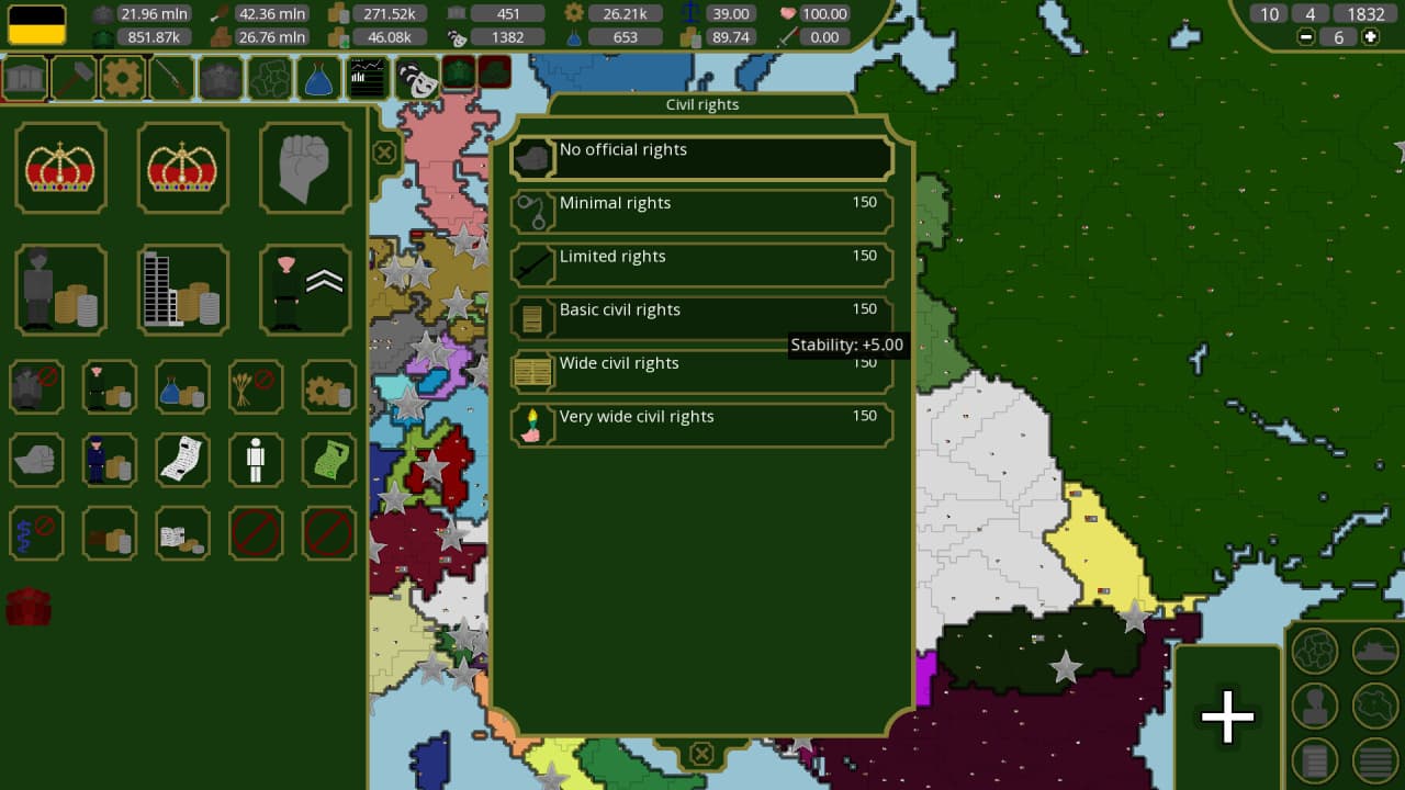 Фундаментом любого сильного государства является стабильность внутри страны. Ключевая задача правителя — обеспечение населения продовольствием, товарами и чувством безопасности, поскольку пренебрежение этими факторами неминуемо ведет к коллапсу. Проект Nations ставит перед руководителем выбор между концентрацией на внутреннем развитии или на расширении территориального влияния. Для достижения процветания доступен широкий спектр инструментов, позволяющий: