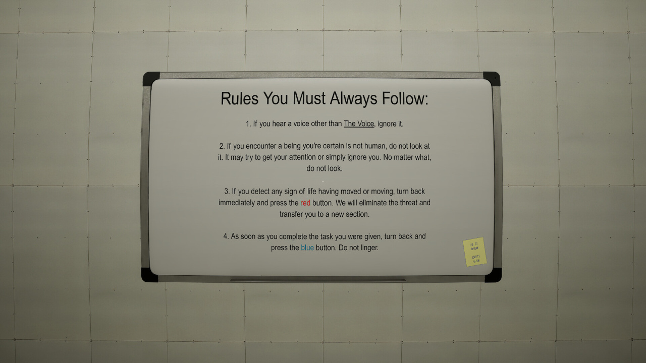 Весь процесс прохождения построен на выполнении директив под постоянным давлением и решении нетривиальных задач, выходящих за рамки стандартных поручений. Выживание в Obey the Voice напрямую зависит от внимательности и неукоснительного соблюдения строгих инструкций. Каждая ошибка наказывается незамедлительно, а все испытания созданы вручную, исключая любые случайные события. Для успешного продвижения необходимо следовать определенному своду правил: