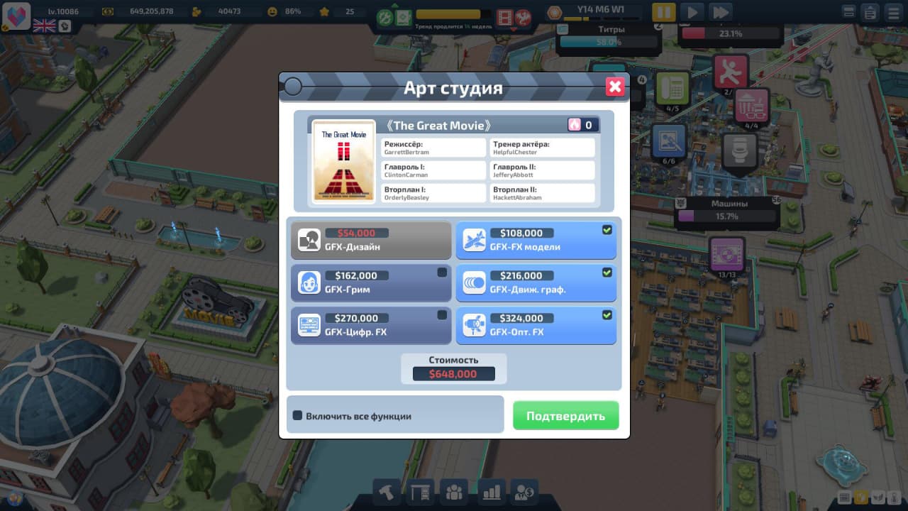Super Movie Tycoon RUS v Build 21878949 Новая версия Полная версия Последняя в альт. раздачах Дата выхода 30 окт. 2025 Разработчик Yuedong Game Жанр Симуляторы, Стратегии, Выживание В основном положительные на основе 300 обзоров в Steam 77% Обновлено 29 октября 2025, 10:04 Список изменений Super Movie Tycoon — восхождение к вершинам кинематографической славы, где создаются вечные шедевры, способные покорить главные международные фестивали. Путь к легендарному статусу в истории кино лежит через тотальное доминирование на глобальной арене. Здесь каждая новая картина становится претендентом на престижные награды, а выстроенная голливудская империя выделяется на фоне острой конкуренции. Успех достигается благодаря комплексному подходу, охватывающему все аспекты кинопроизводства от идеи до премьерного показа. Полный контроль над творческим процессом позволяет воплощать самые смелые замыслы. В Super Movie Tycoon игрок совмещает роли сценариста, режиссера и продюсера, собственноручно прорабатывая каждую деталь будущего блокбастера. Формирование съемочной группы из первоклассных специалистов — от гениальных авторов до ветеранов съемочной площадки — напрямую влияет на конечный результат. Уникальная система креативности, использующая карты Вдохновения и Эмоций, придает глубину написанию сценариев и позволяет создавать по-настоящему запоминающиеся истории. Основой для творческих свершений служит грамотное планирование и расширение собственной студии. Постепенное открытие новых земельных участков и размещение на них профильных департаментов формирует высокоэффективный производственный конвейер. Оптимизация всех операций, начиная от контроля за бюджетом и заканчивая составлением графиков съемок, происходит на основе точных данных. Именно такая отлаженная система позволяет превратить скромную киностудию в могущественную развлекательную корпорацию, диктующую свои правила всему миру. Скачать торрент Скриншоты Показать больше Видео из игры Скачать Super Movie Tycoon Тип релиза Пиратка Portable (Таблетка: Вшита) Версия v 1.2.3 Build 21692343 Размер 1.2 ГБ Интерфейс Русский Озвучка Отсутствует Установка: Примечание Более актуальная версия: v Build 21878949находится в блоке - Альтернативные раздачи. Скачать .torrent торрент файл Скачать БЕЗ торрента прямая ссылка через uTorria Альтернативные раздачи Прямые ссылки Облачные хранилища v Build 21878949 614 МБ Показать Системные требования ОС: Windows 10, 11 Процессор: 2 ГГц / Core Оперативная память: 2 ГБ Видеокарта: 128МБ Место на диске: 1 ГБ Менеджмент, Экономика, Градостроение, Капитализм, Строительство, Тайм-менеджмент, Управление ресурсами, Реиграбельность, Иммерсивный симулятор, Песочница, Строительство базы, Симулятор жизни, Расслабляющая