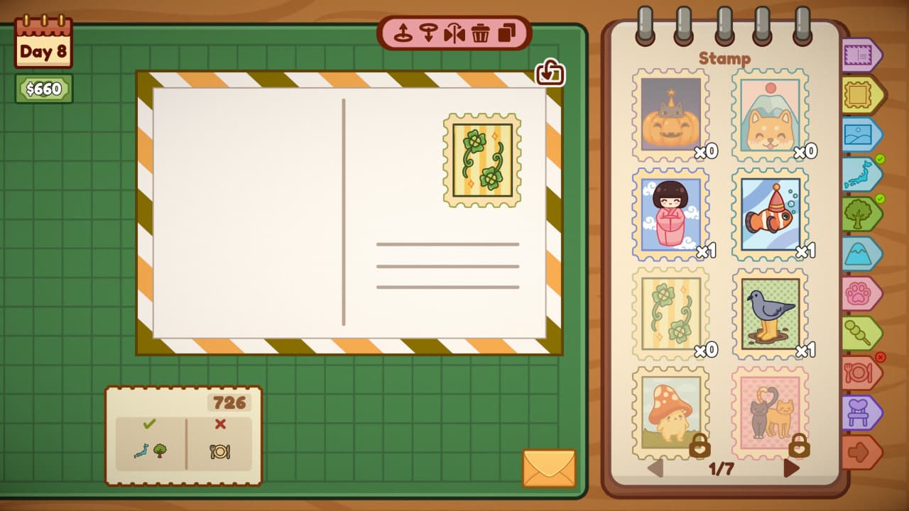 Carefully Stamped RUS v Build 21115166 Новая версия Полная версия Последняя Дата выхода 15 ноя. 2025 Разработчик Rogue Duck Interactive Жанр Симуляторы, Инди, Стратегии Смешанные на основе 120 обзоров в Steam 62% Обновлено 29 октября 2025, 12:45 Список изменений Carefully Stamped — симулятор уютной мастерской, где творчество обретает форму почтовых отправлений. Здесь потоки заказов от клиентов превращаются в возможность проявить свой художественный талант. Каждая открытка становится уникальным произведением, созданным вручную в расслабляющей атмосфере красочной песочницы. Процесс начинается с чистого листа, на котором предстоит скомпоновать идеальный дизайн, чтобы затем отправить готовое послание адресату. Центральной фигурой этого мира является дизайнер открыток, чья главная задача — воплощать пожелания заказчиков в жизнь. Необходимо не только подобрать идеальное оформление, но и написать душевную записку, завершая работу подбором подходящих марок. Проект Carefully Stamped предлагает погрузиться в медитативный геймплей, где основной механикой выступает создание и продажа очаровательных почтовых карточек. Успешное выполнение заказов позволяет расширять свою коллекцию инструментов и декоративных элементов для будущих творений. Инструментарий почтового мастера: Прием новых заказов для создания милых писем. Написание искренних и теплых заметок для получателей. Коллекционирование разнообразных марок для отправки. Творческий процесс оформления уникальных карточек. Скачать торрент Скриншоты Показать больше Видео из игры Скачать Carefully Stamped Тип релиза Пиратка (Таблетка: Не требуется) Версия v Build 21115166 (Полная) Последняя Размер 263 МБ Интерфейс Русский Озвучка Русская Установка: Скачать .torrent торрент файл Скачать БЕЗ торрента прямая ссылка через uTorria Системные требования ОС: Windows 7, 8, 10 (64 бита) Процессор: Intel Pentium g860 Оперативная память: 1 ГБ Видеокарта: Nvidia GeForce 840m Место на диске: 1 ГБ Симулятор жизни, Иммерсивный симулятор, Игры в 2D, Казуальная, Расслабляющая, Песочница, Милая, Point and click, Цветастая, Головоломка, Поиск предметов, Экономика, Рисованная графика