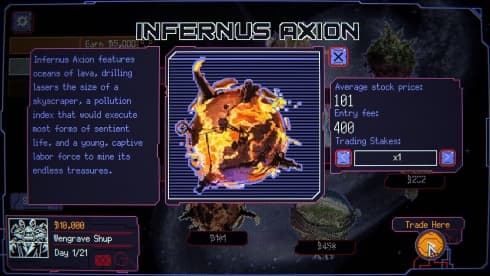 Процесс обогащения разворачивается на семи планетах, каждая из которых предлагает собственное видение продуктивности и прибыльности. Короткие сессии с аркадным темпом требуют быстрой реакции на события, будь то внезапное обогащение симулированной жизни или ее стремительное падение в долговую яму. В Space Warlord Baby Trading Simulator основной задачей является накопление достаточного количества кредитов за отведенное время. Успешное завершение контракта приносит бронзовые, серебряные или золотые трофеи, а сложность возрастает по мере продвижения через истории различных спекулянтов.