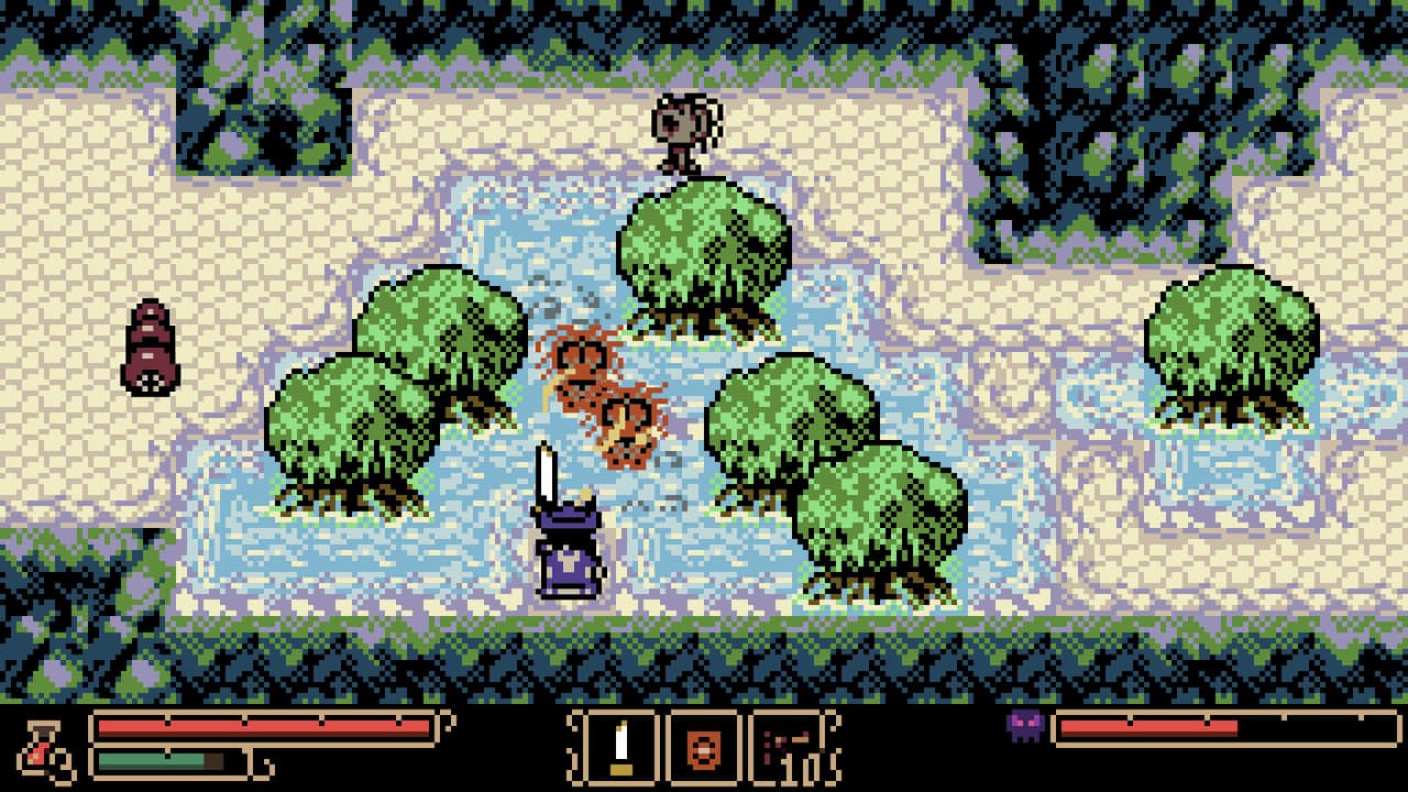 Tearscape, мрачное пиксельное приключение с видом сверху, ставит во главу угла точную и выверенную боевую систему, где выживание напрямую зависит от реакции и грамотного распределения ресурсов. Основным инструментом для устранения гротескных противников служит клинок, а своевременный перекат позволяет не только избегать атак, но и преодолевать небольшие разломы. Каждое действие, от атаки до рывка, истощает запас выносливости, требуя от охотника постоянно следить за зеленой шкалой. Собранные с поверженных врагов Слезы служат валютой для улучшения характеристик. Точками возрождения и прокачки выступают каменные статуи, активация которых восстанавливает здоровье и ограниченный запас лечебных фляг, одновременно возвращая к жизни всех рядовых монстров в округе.