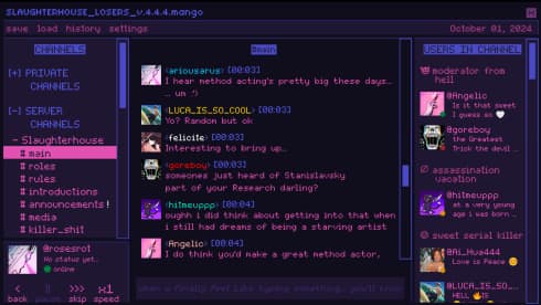 Killer Chat! - Expanded Edition v 1.4.1 Новая версия Полная версия Последняя Дата выхода 2026 Разработчик rosesrot Жанр Симуляторы, Визуальная новелла, Инди, RPG Обновлено 5 ноября 2025, 13:47 Список изменений Killer Chat! Expanded Edition — погружение в мрачный мир, где единственный способ собрать материал для криминального романа — притвориться одним из его персонажей. Главный герой, амбициозный писатель, в поисках достоверных деталей для своей книги заходит слишком далеко в своих интернет-запросах. Результатом становится неожиданное приглашение в закрытый чат, участники которого являются настоящими серийными убийцами. Теперь первостепенная задача — поддерживать легенду, чтобы не быть разоблаченным и, возможно, убитым. Цена ошибки в этом анонимном сообществе невероятно высока и измеряется человеческой жизнью. Шесть месяцев предстоит балансировать на грани, ведя напряженные переписки и получая личные сообщения от четырех колоритных убийц. В Killer Chat! - Expanded Edition каждое решение напрямую влияет на развитие нелинейного сюжета, насчитывающего более 20 уникальных финалов. Геймплей предлагает не только текстовое общение, но и полностью озвученные видео- и аудиозвонки, позволяющие глубже узнать потенциальных романтических партнеров и их тёмные секреты. Выбор пути определяет всё: обретёт ли персонаж мрачное счастье, станет очередной жертвой, чья история пополнит новостные сводки, или же полностью примет свою тёмную сторону. Секреты переписки с убийцами: Соблюдать осторожность в каждом сообщении, ведь любой неверный шаг может раскрыть обман. Изучать личности четырех собеседников, чтобы использовать их слабости или избежать их гнева. Принимать участие в озвученных звонках для сбора уникальной информации и продвижения по сюжету. Приготовиться к тому, что невинный флирт может легко обернуться смертельной угрозой. Скачать торрент Скриншоты Показать больше Скачать Killer Chat! - Expanded Edition Тип релиза Пиратка (Таблетка: Вшита) Версия v 1.4.1 (Полная) Последняя Размер 317 МБ Интерфейс Английский Озвучка Английская Установка: Скачать .torrent торрент файл Скачать БЕЗ торрента прямая ссылка через uTorria Системные требования ОС: Windows 7, 8, 10 (64 бита) Процессор: 64-bit intel Оперативная память: 512 МБ Видеокарта: OpenGL 3.0 Романтика, Хорроры, Психологический хоррор, Кастомизация персонажа, Мрачная, Выбери себе приключение, Иммерсивный симулятор, Чёрный юмор, Атмосферная, От первого лица, Юмор, Криминал, Несколько концовок, Глубокий сюжет, Казуальная