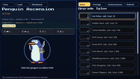 Процесс накопления основного ресурса, Рыбы, осуществляется через клики, а заработанные средства вкладываются в приобретение разнообразных апгрейдов. Эти улучшения повышают эффективность как активной, так и пассивной добычи, позволяя колонии функционировать даже в отсутствие геймера. В Penguin Ascension также присутствуют случайные события, вносящие разнообразие в размеренный темп развития. Проект ориентирован на доставление удовольствия от постоянно растущих показателей и созерцания того, как маленькое начинание одного предприимчивого пингвина перерастает в масштабную полярную державу.