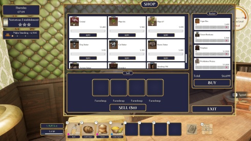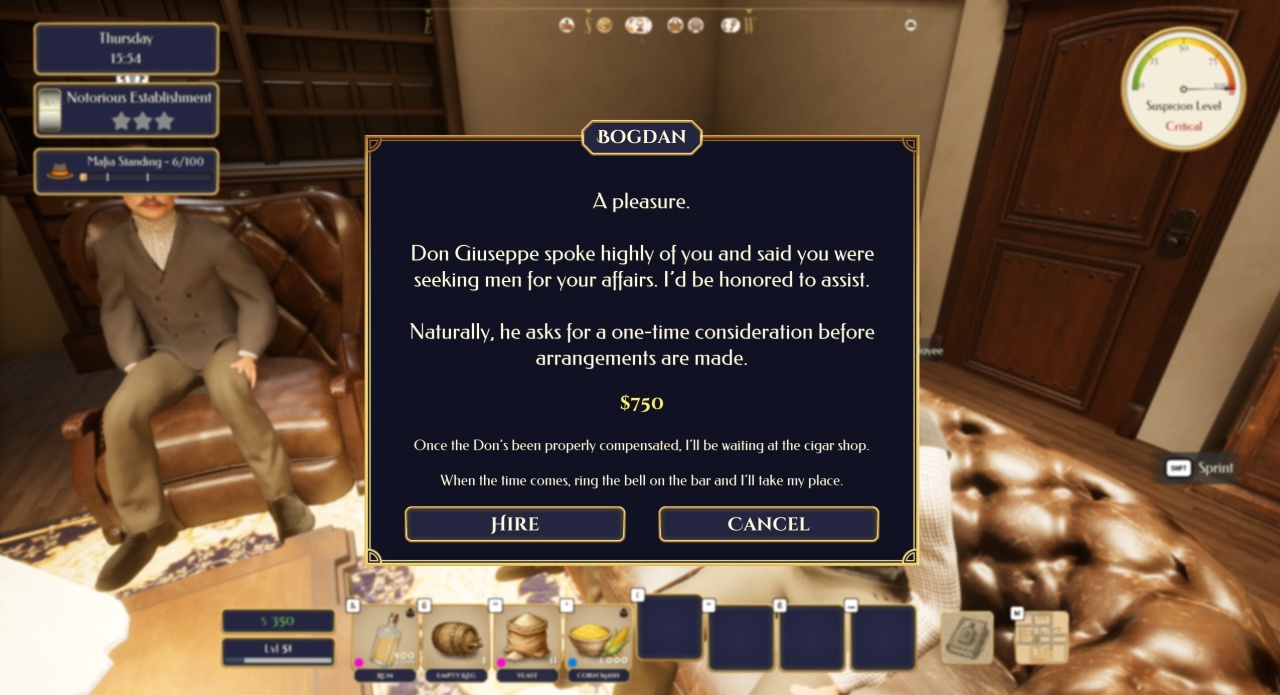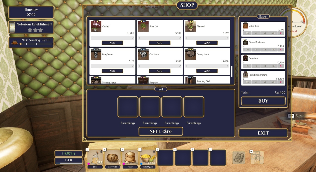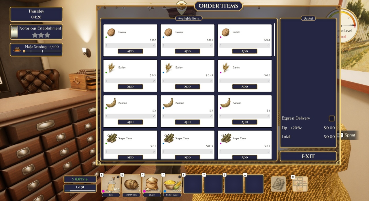 Основой всего дела является процесс дистилляции спиртных напитков из разнообразного сырья. Стратегическая глубина достигается за счет выбора между быстрой прибылью от оптовых сделок с мафией и долгосрочным доходом от розничной продажи напитков клиентам. Успешное руководство предприятием в Speakeasy Simulator подразумевает контроль над всеми аспектами его деятельности, требуя от управляющего: