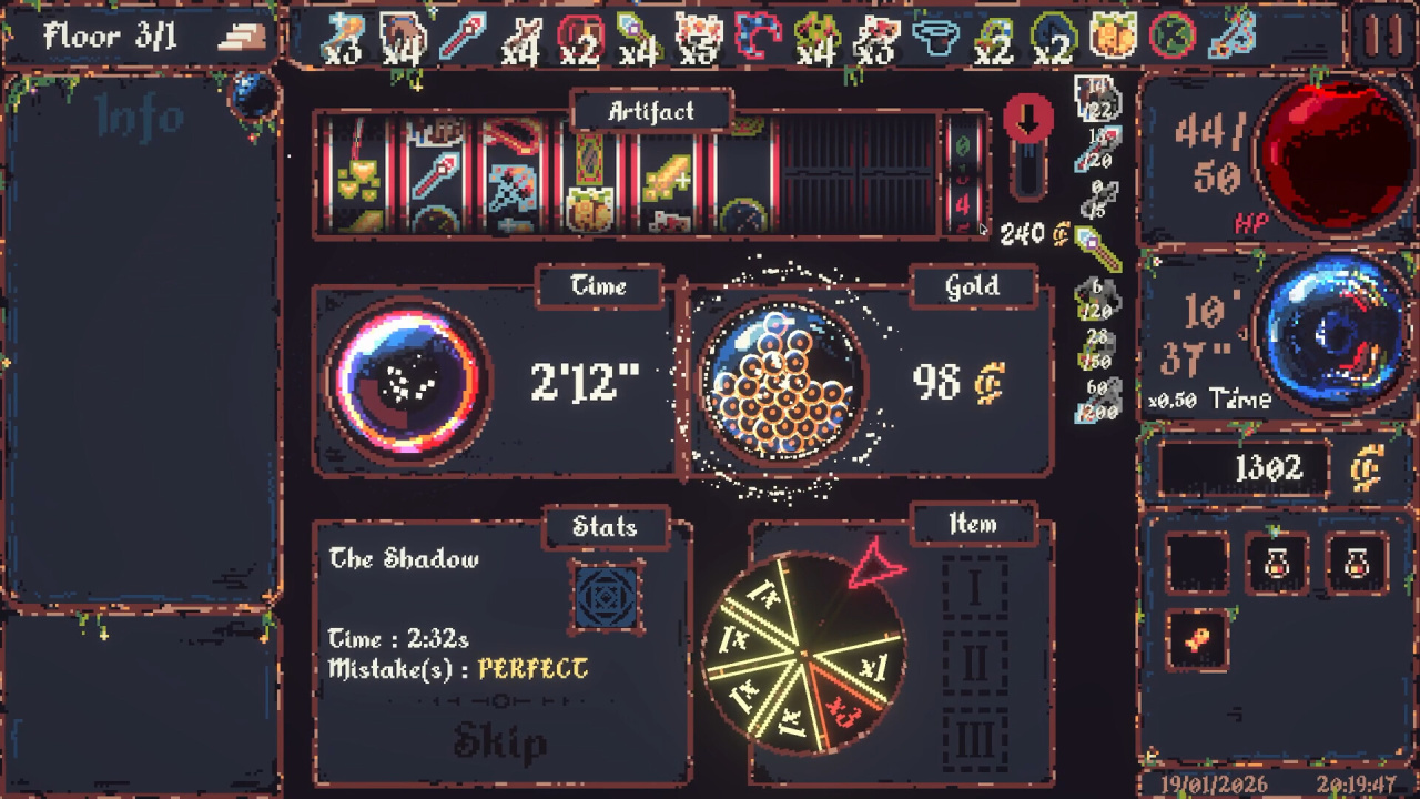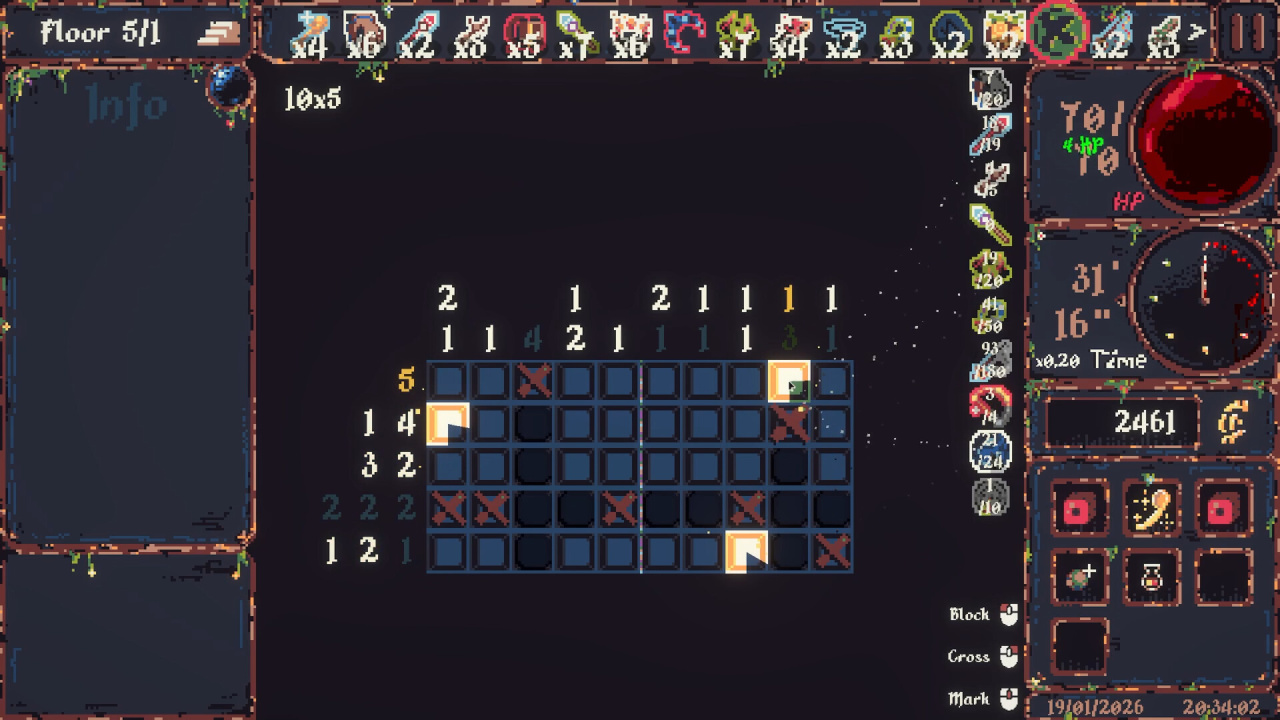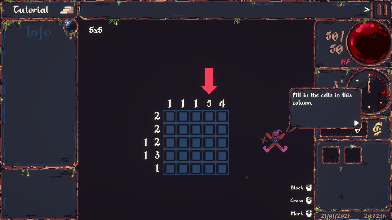 CiniCross — это напряженный спуск в мрачные подземелья, где каждый шаг вглубь означает столкновение с новой головоломкой. Основой всего процесса является разгадывание японских кроссвордов в условиях постоянной нехватки времени. Главным противником выступает неумолимый таймер, счетчик которого не обнуляется между этажами, а лишь пополняется за успешные действия. Любое промедление или ошибка приводят к получению урона, что заставляет действовать предельно сконцентрированно. В конце каждого уровня путника ждет встреча со стражем, вносящим в привычные правила дополнительные испытания.