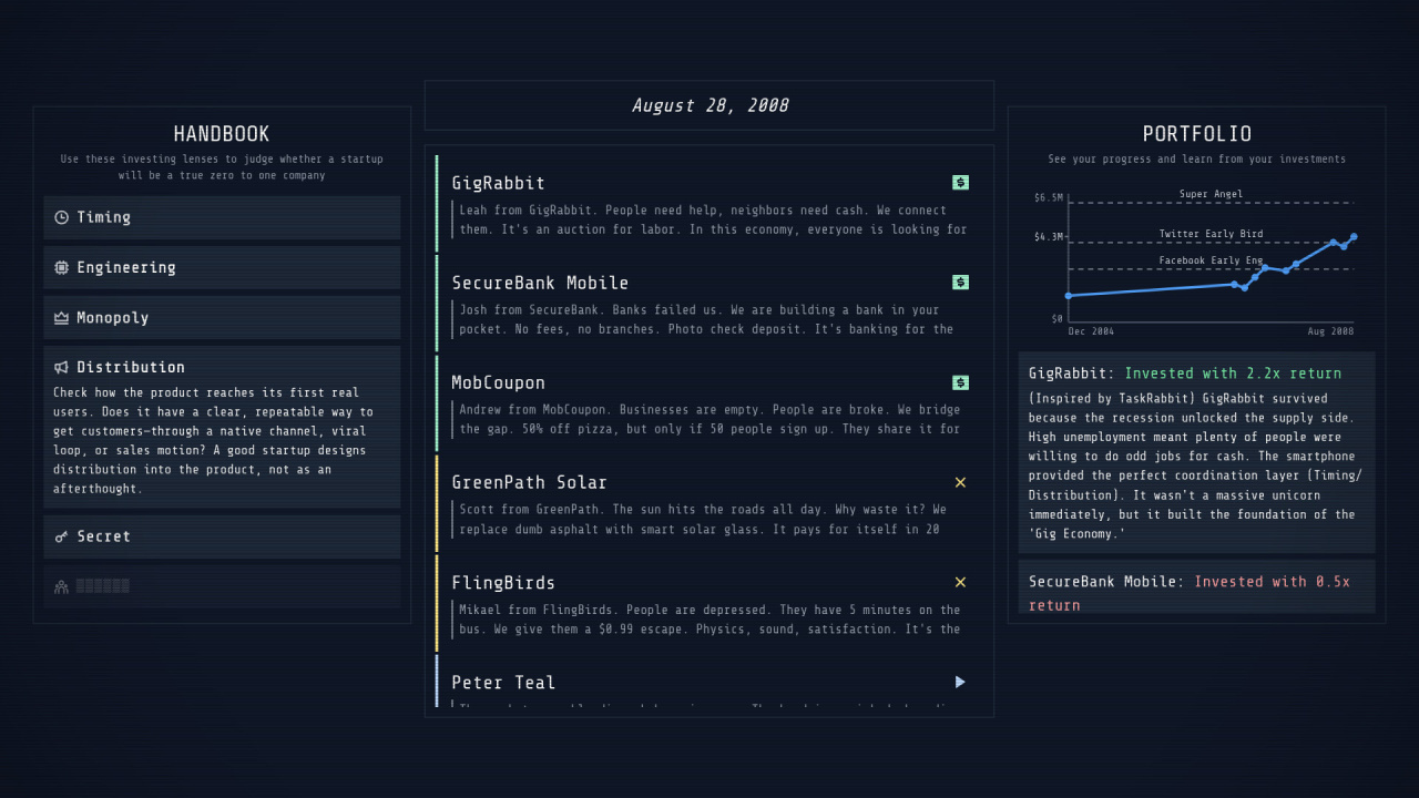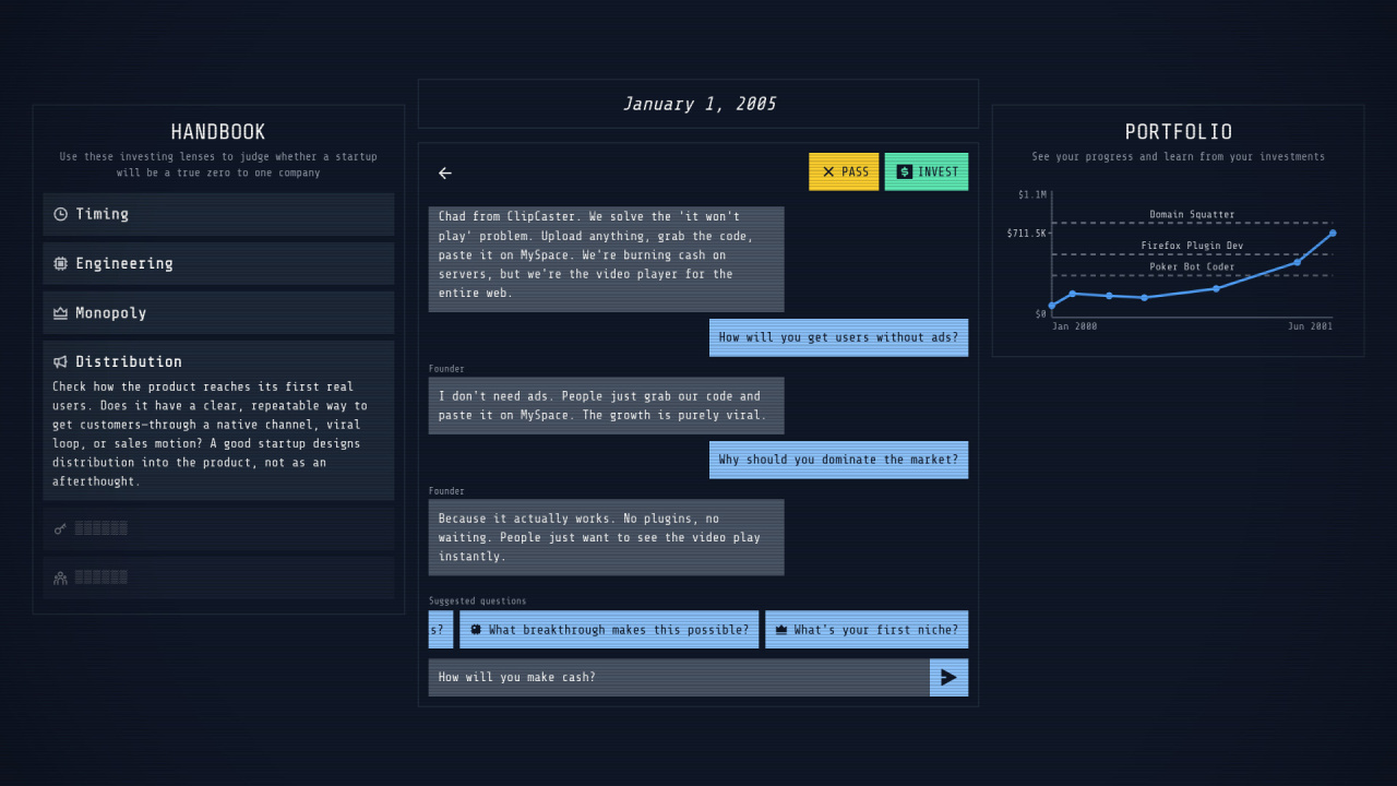 ZeroOne Terminal — это текстовая стратегия, предлагающая примерить на себя роль венчурного инвестора на протяжении 20 лет истории технологической индустрии. Проект охватывает период с 2000 по 2020 год, позволяя стать свидетелем как краха доткомов, так и расцвета эпохи смартфонов. Основной процесс заключается в анализе многочисленных стартапов, созданных на основе реальных компаний прошлого. Через стилизованный под терминал интерфейс предстоит проводить допросы сгенерированных искусственным интеллектом основателей, чтобы выявить сильные и слабые стороны их бизнес-идей. Целью является формирование успешного инвестиционного портфеля и распознавание будущих гигантов рынка.