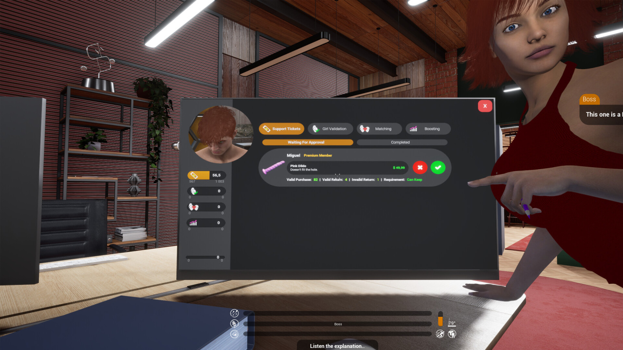 Dont Disturb Your BOSS, концепция которого строится на пикантном нарушении трудовой дисциплины, погружает в атмосферу офисного агентства, где страсть кипит прямо под носом у руководства. Новому сотруднику предстоит не заполнять таблицы, а искать подход к очаровательной сослуживице, стремясь перевести деловые отношения в горизонтальную плоскость. Основной сложностью выступает вездесущий начальник, чья бдительность не ослабевает ни на минуту. Угроза потери должности из-за развратных действий добавляет происходящему остроты, превращая попытки уединения в рискованную игру в кошки-мышки. Успех зависит от умения выбирать правильные моменты для сближения, пока шеф отвлечен или находится в другой части помещения.