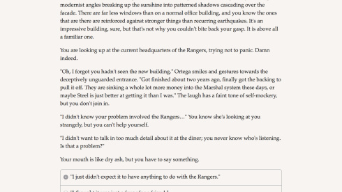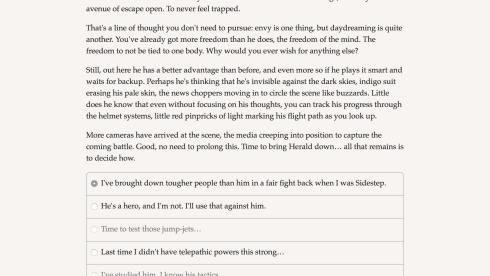 Fallen Hero: Rebirth, выступая текстовым проектом, полагается на воображение геймера при управлении могущественным телепатом. Погружение в чужие разумы позволяет брать под контроль физические оболочки жертв. Геймплей требует жонглирования 3 независимыми личностями. Важным аспектом выживания становится конструирование боевого экзоскелета. Настройка экипировки варьируется от тяжелой брони до маневренного костюма. Нарратив позволяет свободно определять гендерную принадлежность протагониста. Каждое решение открывает перспективы для формирования криминальной империи. Противостояние врагам заставляет грамотно комбинировать доступные ресурсы.