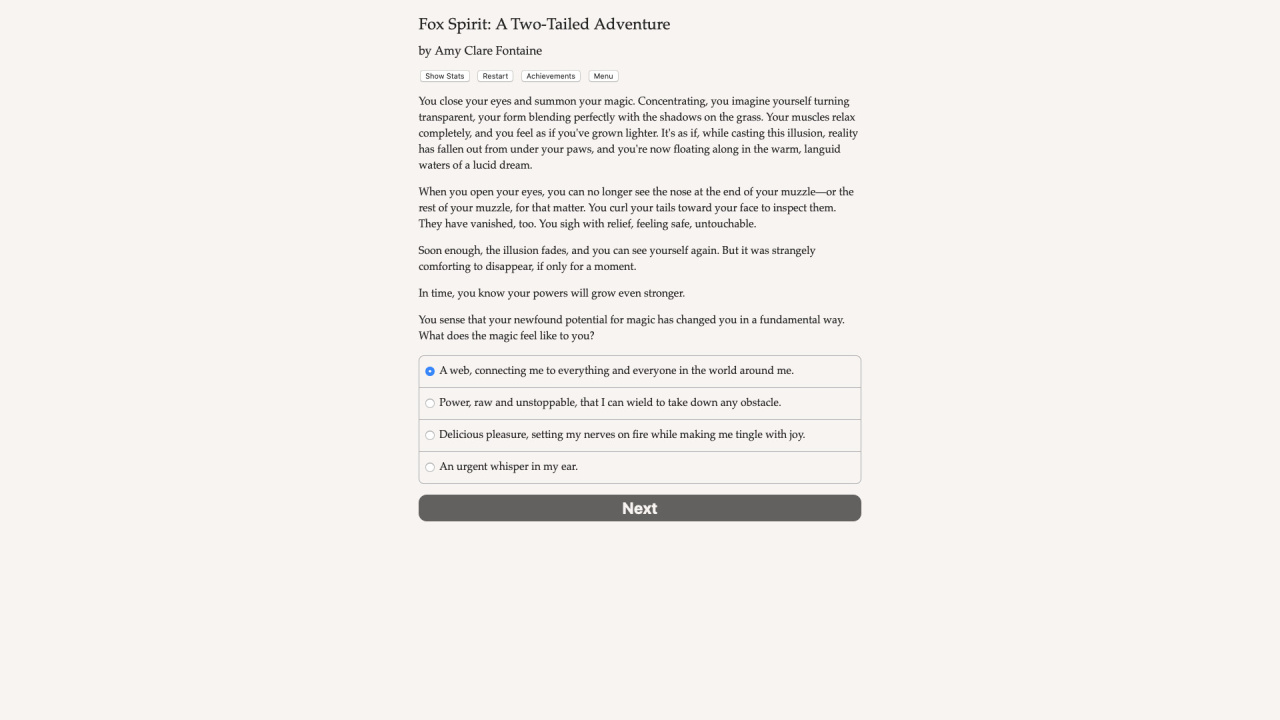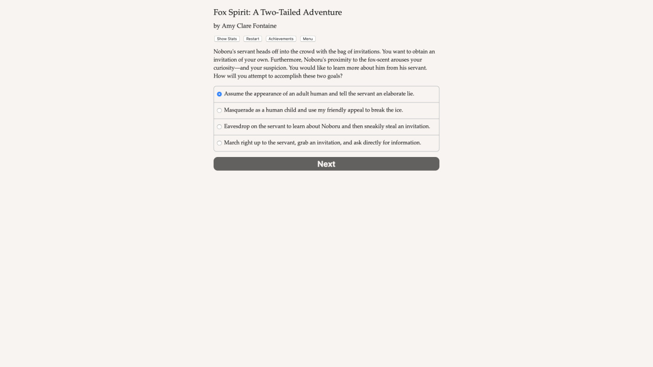 Fox Spirit: A Two-Tailed Adventure — это масштабное интерактивное произведение, созданное писательницей Эми Клэр Фонтейн и полностью лишенное визуального оформления. Восприятие происходящего опирается исключительно на текстовое повествование объемом в 250000 слов. Протагонистом выступает мистическая двухвостая кицунэ, скрывающая свою природу. Главной целью создания становится поиск Звездной сферы, дарующей бессмертие. Артефакт спрятан на территории поселения Хосимори. Именно здесь ранее развернулась трагедия, унесшая жизни родных героя. Теперь геймеру предстоит определить судьбу деревни, балансируя между жаждой мести и прощением. Развитие событий допускает организацию лисьей революции или поддержку империи. Финал истории позволяет уничтожить найденный предмет либо воспользоваться его силой.