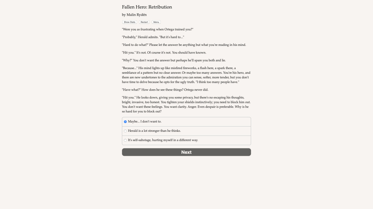 Fallen Hero: Retribution, выступая прямым сюжетным продолжением проекта Rebirth, предлагает геймерам колоссальный текстовый опыт без графического сопровождения. Эта научно-фантастическая история насчитывает полтора миллиона слов, формирующих сложнейшую паутину моральных дилемм. Отсутствие визуала компенсируется глубоким исследованием психологических травм. Процесс прохождения опирается исключительно на выбор поступков, бесповоротно меняющих судьбы людей. Фанаты жанра вольны выстраивать близкие связи с такими неординарными личностями, как Ортега, Доктор Мортум, Леди Аргент, Геральд или Чен. Каждое действие неумолимо направляет повествование к одному из множества финалов, а перенос прогресса из первого эпизода позволяет развить ранее заложенные конфликты.