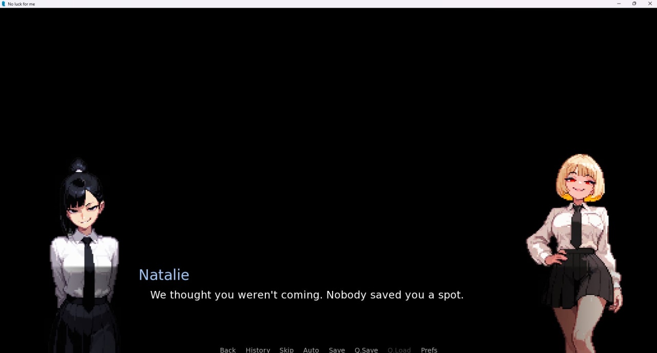 No Luck for Me — мрачная визуальная новелла, сюжет которой посвящен методичному разрушению чужих жизней и бескомпромиссному подчинению бывших обидчиков. Выживание в университетском кампусе требует грамотного распределения часов между утренней рутиной, дневными делами и ночными вылазками. Развитие талантов вроде хакерского взлома, скрытой фотосъемки и налаживания теневых контактов служит инструментом для поиска грязных секретов. Геймплей обязывает контролировать привязанность жертв и пополнять инвентарь посредством подработок. Наблюдение за чужой интимностью перерастает в откровенный вуайеризм, а слежка за студенткой по имени Натали приносит ожидаемые плоды. Добытый компромат позволяет инициировать жесткий шантаж Блэр, заставляя высокомерную особу выполнять любые унизительные приказы.
