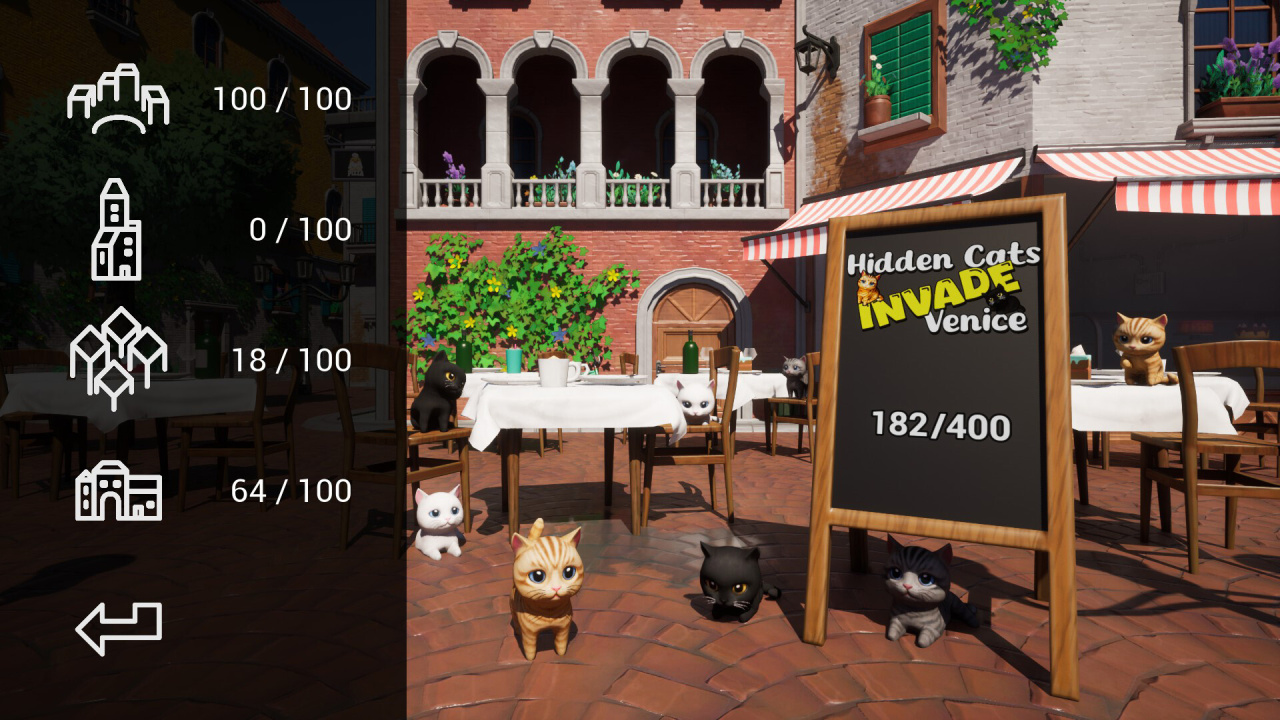 Hidden Cats Invade Venice — пространственная головоломка с поиском предметов, предлагающая медитативный процесс изучения опустевших итальянских улиц. Трехмерные архитектурные ансамбли знаменитого города на воде стали временным пристанищем для шести сотен пушистиков. Коренные жители внезапно исчезли, оставив свои дома во власти пришельцев из загадочного измерения Шерстяная Пелота. Главная задача заключается в планомерном возвращении этих созданий обратно в их родной мир. Процесс обнаружения хвостатых визитеров полностью лишен стрессовых факторов вроде строгих таймеров или штрафных санкций, обеспечивая максимально умиротворяющий опыт. На протяжении девяти детализированных этапов геймеру предстоит внимательно осматривать каждый закоулок, попутно выискивая четверку секретных пингвинов.