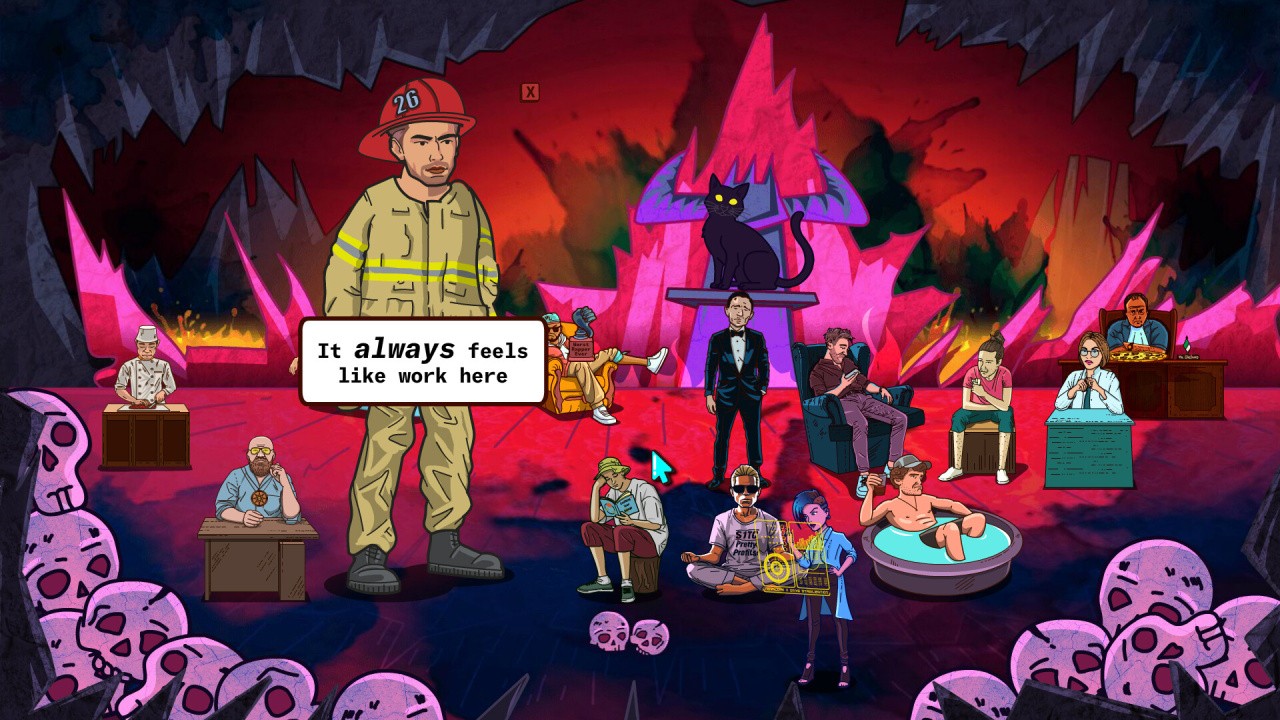 God For A Day, визуальный стиль которого опирается на созданную вручную векторную графику и сопровождается лоу-фай мотивами, предлагает вершить судьбы смертных. Здесь предстоит тщательно изучать личные вещи и сокровенные тайны обитателей мегаполиса Хоупвуд. Каждое постановление вызывает резонанс в социальной сети Kitter, запуская цепочку последствий для остальных горожан. Взаимосвязанные поступки формируют разветвленную структуру повествования, ведущую к скрытым анимированным финалам. 35 душ ожидают вердикта, требуя вдумчивого анализа перед вынесением благословения или проклятия. Разрешение дилемм сдобрено черным юмором, а необычным испытанием становится противостояние Сатане, принявшему облик черного кота за барной стойкой.
