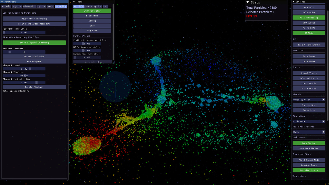 Глобальная цель симулятора сводится к наглядному конструированию вселенной. Интерактивная среда Galaxy Engine дает возможность изучать гравитационные аномалии и распределение темной материи. Геймеру доступно управление колоссальными объемами пространства, начиная от зарождения галактик и заканчивая воссозданием Большого взрыва. Использование гидродинамики сглаженных частиц обеспечивает реалистичное поведение жидкостей и твердых тел. Для формирования уникального опыта виртуальному творцу предстоит: