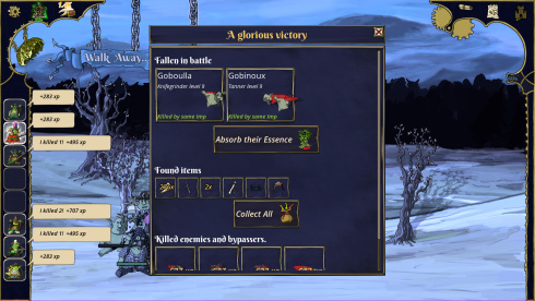 Сражения происходят на гексагональных полях, требуя распределения очков действия между бойцами. Бойцы перемещаются, атакуют или выкрикивают оскорбления врагам. Процесс Gobs and Gods позволяет переключаться в режим реального времени для завершения стычек. Дефицитная эссенция открывает доступ к мощным приемам, требуя взвешенных решений. Система прогрессии базируется на концепции расходного материала: гибель юнита не ведет к фиаско. Божество поглощает опыт павшего слуги, конвертируя его в очки веры для усиления сверхъестественных способностей.