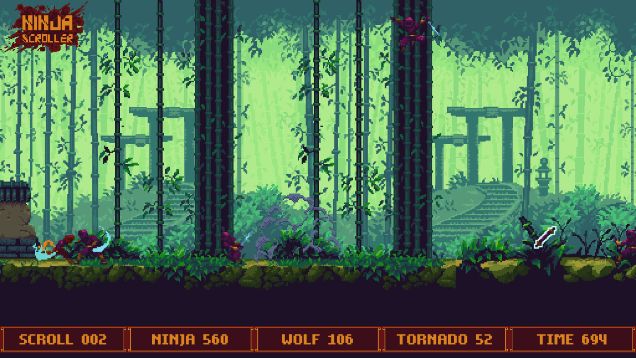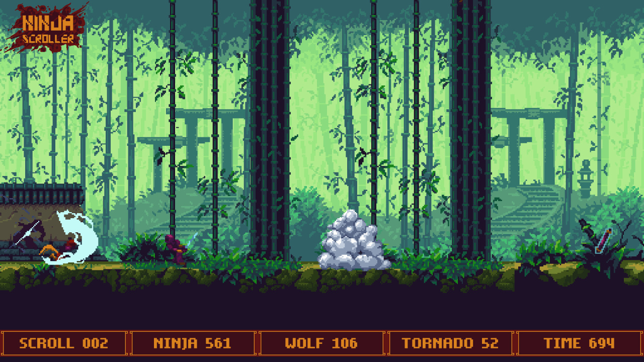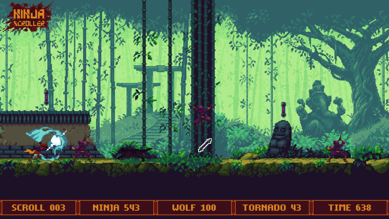 Ninja Scroller — пиксельный экшен-раннер, в котором мастерство владения техниками скрытности и быстрого перемещения становится единственным залогом выживания. Основная миссия заключается в поиске 100 теневых свитков, разбросанных по 7 проработанным этапам, наполненным опасными противниками и природными катаклизмами. Перед протагонистом встают не только опытные воины тени и свирепые волки, но и могущественные Стражи, победа над которыми требует идеального тайминга. Ограничение по времени заставляет постоянно двигаться вперед, однако уникальная возможность кратковременной остановки позволяет оценить обстановку и скорректировать маршрут. Ретро-эстетика дополняется современным подходом к сложности, предлагая 3 различных режима для фанатов жанра с разным уровнем подготовки.
