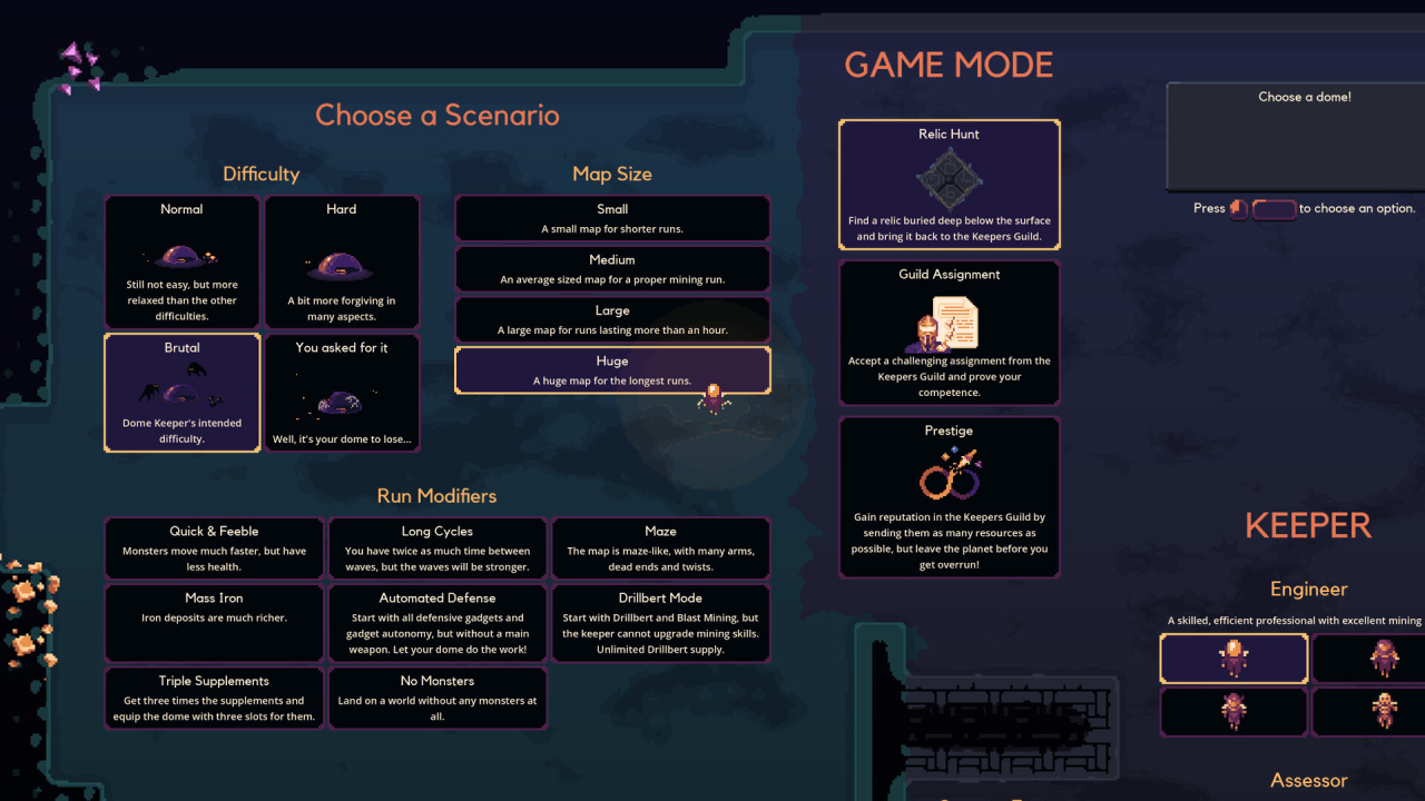 Подземные экспедиции в Dome Keeper сопряжены с высоким риском, поскольку каждый добытый минерал влияет на мощность лазерных установок или остроту стального клинка. Улучшение реактивного ранца и бура значительно ускоряет перемещение по разветвленной схеме туннелей. Помимо ископаемых, глубоко в недрах таятся древние артефакты, дарующие пассивные усиления. Оборона требует ювелирной точности управления ротационным лазером, испепеляющим группы летающих и наземных тварей. Альтернативный режим охоты за реликвией превращает сбор ресурсов в спецоперацию по поиску мощного устройства для аннигиляции захватчиков. Пиксельная визуализация и атмосферное звуковое сопровождение создают эффект погружения в мрачный мир космоса.