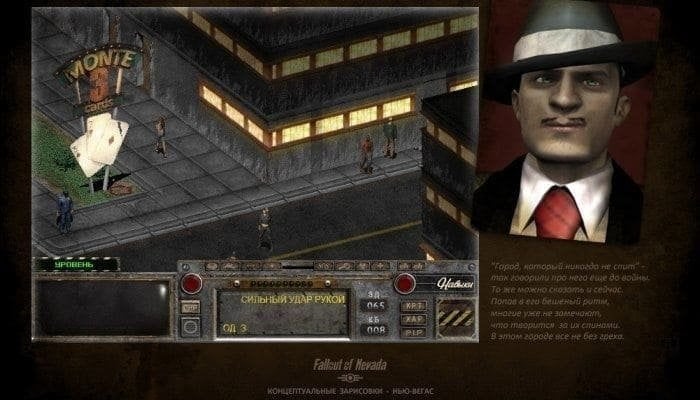 Fallout: Nevada — созданная на движке “Fallout 2” RPG во вселенной “Fallout”. Игра была создана фанатами оригинальных частей легендарной серии, но не является ни дополнением, ни продолжением предыдущих игр вселенной. Это самодостаточный проект, использующий, помимо движка, всё тот же игровой постапокалиптический мир Пустошей после Великой Войны.