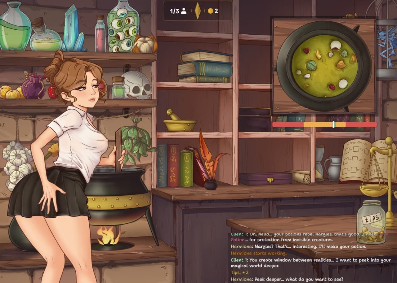 Hermione's Shop RUS v 0.2.3 Новая версия Полная версия Последняя Дата выхода 2026 Разработчик Kurotica Team Жанр Обновлено 2 февраля 2026, 11:44 Список изменений Hermiones Shop — это история об отчаянной попытке молодой волшебницы наладить свою жизнь после вероломного поступка близких друзей, которые исчезли вместе со всеми ее деньгами. Оставшись без средств к существованию, Гермиона принимает предложение Дамблдора и открывает собственную лавку по продаже зелий. Местом для ведения бизнеса становится таинственная старая лаборатория, некогда принадлежавшая самому Снеггу, что добавляет интриги в повествование. Теперь главной героине необходимо не только в совершенстве освоить искусство зельеварения, но и противостоять постоянному давлению со стороны коллекторов из банка Гринготтс. Ситуацию усугубляет и пристальный надзор ее бывшего преподавателя, который регулярно устраивает строгие проверки. Ежедневная рутина заставляет искать баланс между честным трудом и более нетрадиционными методами заработка. Игровой процесс в Hermiones Shop требует от геймера большой изобретательности для привлечения и удержания покупателей, которые должны оставаться довольными и оставлять щедрые чаевые. Чтобы обеспечить процветание своего дела и рассчитаться со всеми долгами, предстоит выполнять множество задач: создавать и реализовывать различные эликсиры для погашения банковской задолженности; заниматься поиском новых рецептур с уникальными и порой весьма пикантными свойствами; успешно проходить еженедельные инспекции от Снегга, стремящегося найти изъяны в работе; осуществлять модернизацию торгового помещения и личного жилого пространства для доступа к новым возможностям. Скачать торрент Скриншоты Скачать Hermione's Shop Тип релиза Пиратка (Таблетка: Вшита) Версия v 0.2.3 (Полная) Последняя Размер 570.2 МБ Интерфейс Русский Озвучка Отсутствует Установка и запуск: Скачать .torrent торрент файл Скачать БЕЗ торрента прямая ссылка через uTorria Альтернативные раздачи Прямые ссылки Облачные хранилища v 0.2.4 427 МБ Показать Системные требования ОС: 7, 8, 10, 11 Процессор: Dual Core 2.4 GHz Оперативная память: 2 ГБ Видеокарта: 2 ГБ Нагота