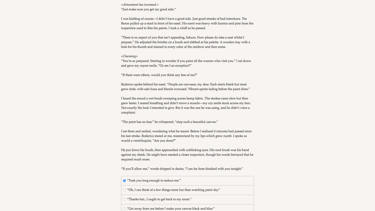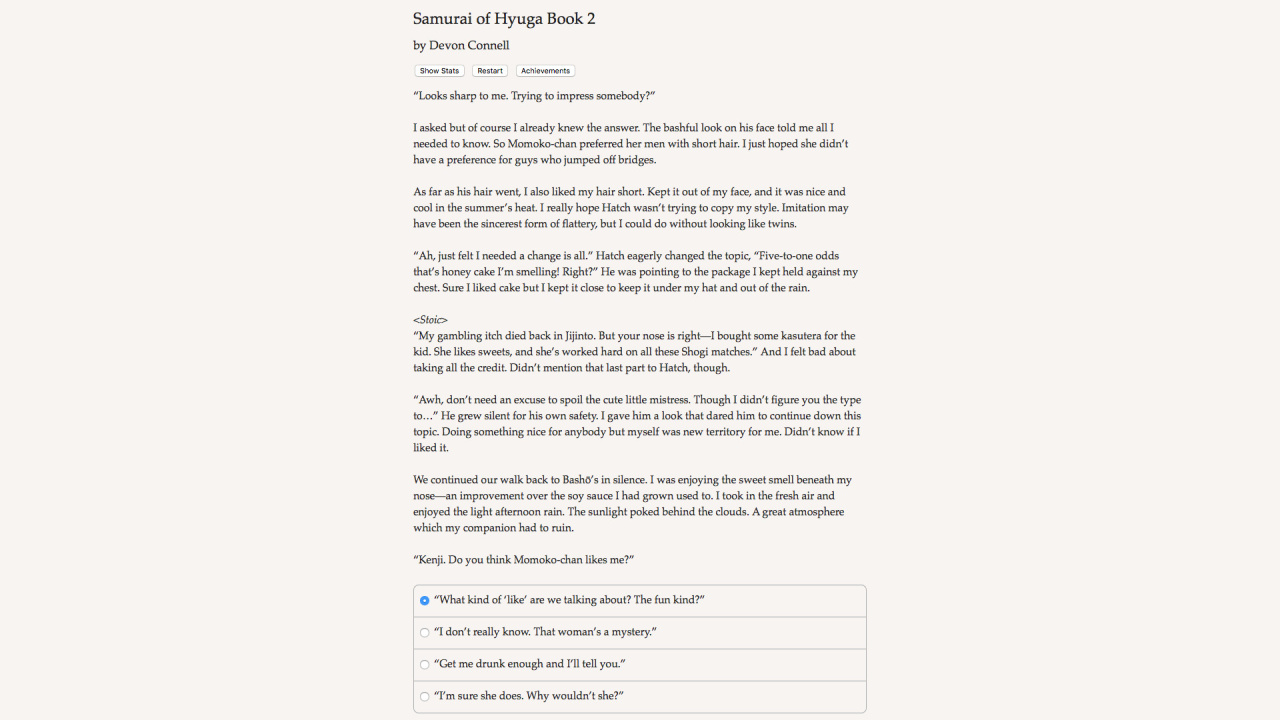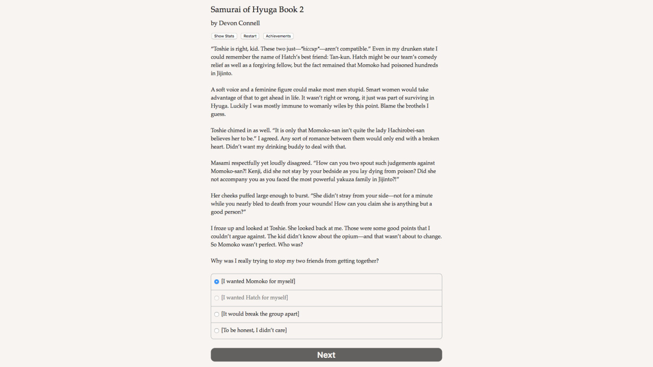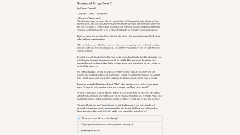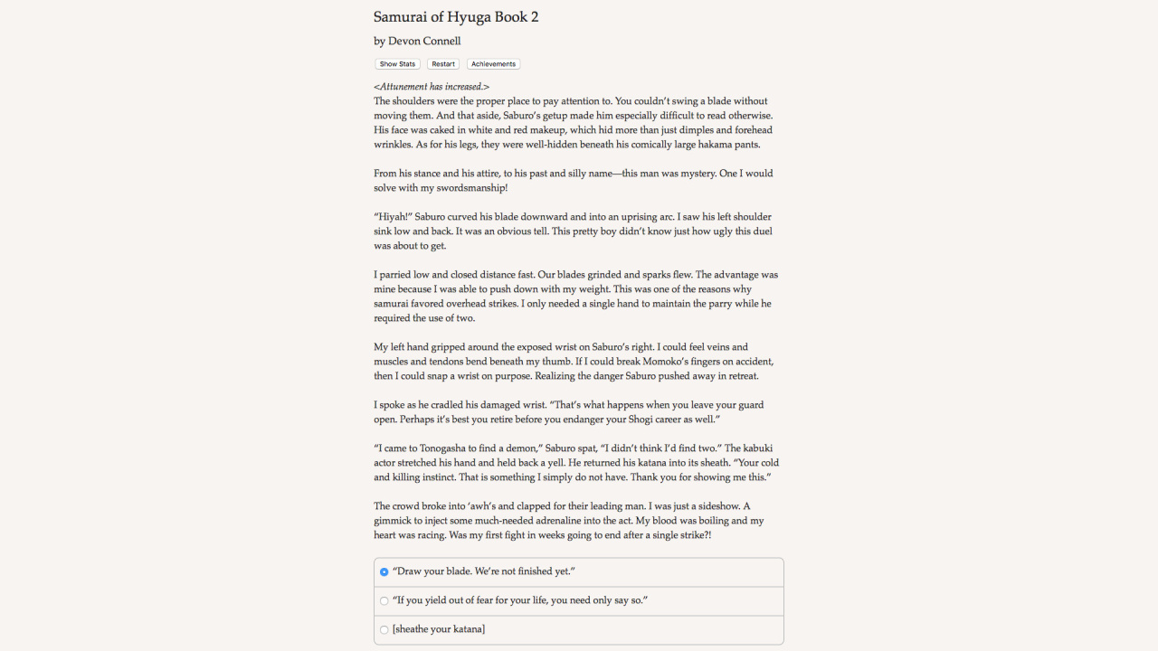 Samurai of Hyuga Book 2 v Build 21400118 Новая версия Полная версия Последняя Дата выхода 16 сен. 2016 Разработчик Hosted Games Жанр RPG, Инди, Приключения, Аниме Очень положительные на основе 50 обзоров в Steam 88% Обновлено 11 апреля 2026, 13:37 Список изменений Samurai of Hyuga Book 2, мрачный мир которой переплетает историческую достоверность феодальной Японии с пугающими проявлениями сверхъестественного, заставляет примерить роль сурового ронина. Лишившись господина, протагонист вынужден маневрировать в паутине политических интриг и духовных противостояний. Повествование подхватывает сюжетную нить сразу после завершения первой главы, погружая в атмосферу шелка и стали. Уникальный литературный стиль оживляет образы ниндзя и мистических существ, населяющих эти земли. Отсутствие визуального ряда компенсируется детальной проработкой окружения, полагающейся на воображение аудитории. Каждое действие сопровождается мучительными раздумьями, стирающими грань между благородством и бесчестьем. Вторая часть расширяет горизонты персонализации, позволяя тонко настроить внешность, мировоззрение и даже сексуальную ориентацию персонажа. Samurai of Hyuga Book 2 предлагает обновленную систему сражений, где выбор конкретной техники боя определяет исход столкновений с опасными противниками. Навыки фехтования здесь соседствуют с поэтическим искусством и настольными играми, создавая многогранный образ воина. Романтические линии приобрели более запутанный характер, порой граничащий с помешательством. Главный герой волен стать самоотверженным защитником или хладнокровным убийцей, ищущим оправдание своим поступкам. Масштабное текстовое полотно, насчитывающее 215 000 слов, гарантирует вариативность прохождения. Странствие по охваченным хаосом провинциям превращается в испытание для рассудка, когда реальность и наваждение становятся неразличимы. Посещение постановок кабуки и свидания перемежаются кровавыми стычками, требующими применения специфических умений. Концепция бусидо здесь подвергается деконструкции, заставляя пересматривать привычные моральные ориентиры. Высокая плотность повествования удерживает внимание, несмотря на аскетичный формат подачи информации. Отношения с окружающими меняются под давлением принятых решений, формируя уникальный финал каждой истории. Подобное эпическое приключение проверяет способность сохранять человечность в условиях вечного столкновения демонических сил и человеческих страстей. Скачать торрент Скриншоты Показать больше Скачать БЕЗ торрента прямая ссылка через uTorria Альтернативные раздачи Прямые ссылки Облачные хранилища v Build 21400118 98 МБ Показать Системные требования ОС: Windows 7, 8, 10 (64-bit) Процессор: Intel Core Duo Оперативная память: 2 ГБ Видеокарта: 1 ГБ Место на диске: 200 МБ Выбери себе приключение