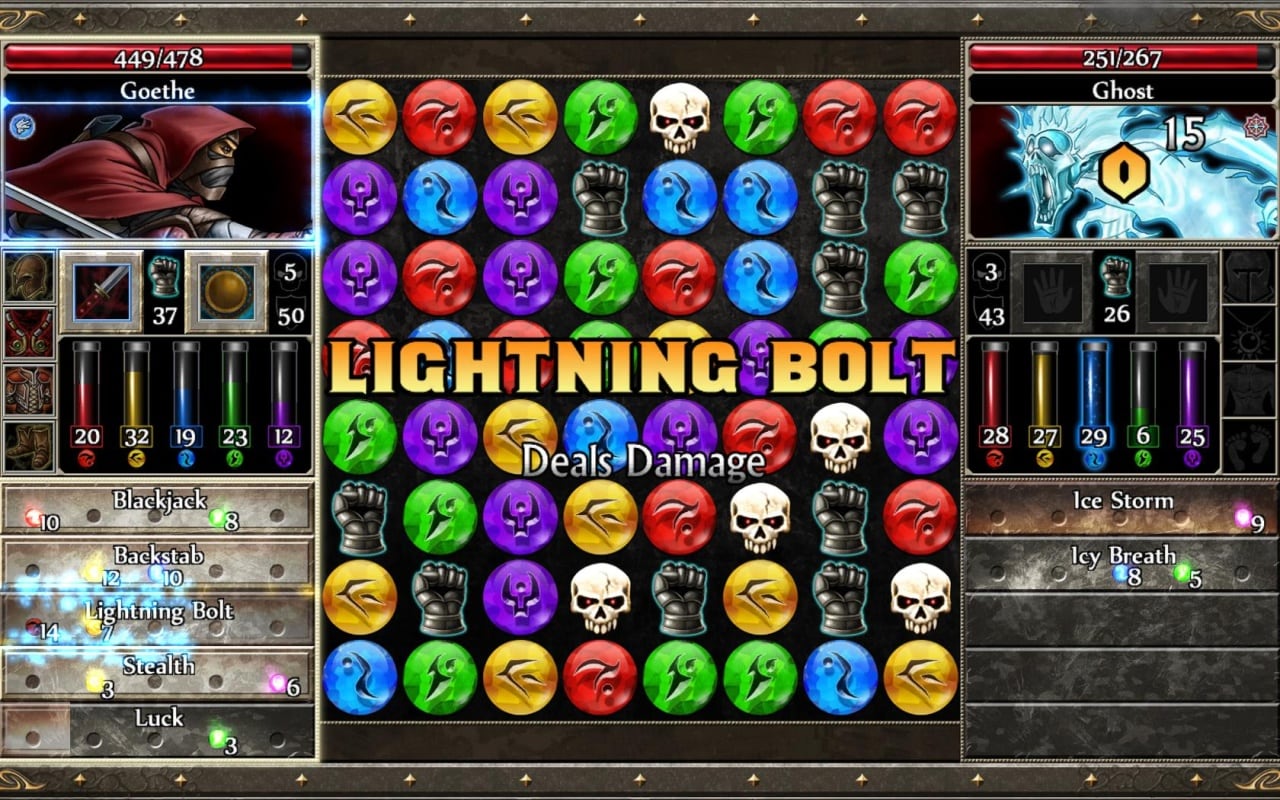 У каждого персонажа есть пять основных атрибутов. Сила (красный цвет) увеличивает вероятность критического удара из оружия и количество бонусного урона, который наносят соответствующие черепа. Ловкость (желтый цвет) увеличивает вероятность блокирования атаки и количество бонусных очков, полученных от сопоставления драгоценных камней действия. Интеллект (синий) увеличивает количество дополнительных ходов и количество маны, которое персонаж может хранить. Выносливость (зеленый цвет) увеличивает вероятность критической блокировки и количество очков жизни у игрока. А моральный дух (фиолетовый) увеличивает шанс противостоять заклинанию противника и количеству урона, наносимого оружием. Сказать, что игра затягивает - ничего не сказать. Затягивающая атмосфера и приятная графика делают своё дело. Несомненно, что вы будете возвращаться к процессу снова и снова, ведь враги сами себя не победят!