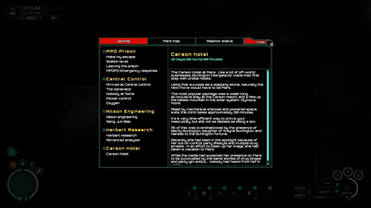 Доктор не просто так решился на участие в проекте: это поможет ему продолжить исследования, позволяющие создать лекарство, способное справиться с болезнью Альцгеймера, ведь им болеет его супруга. Однако по прибытию на Марс он не успевает толком ничего сделать, поскольку в лаборатории произошло чрезвычайное происшествие, из-за которого его обвинили в убийстве и посадили в карцер.