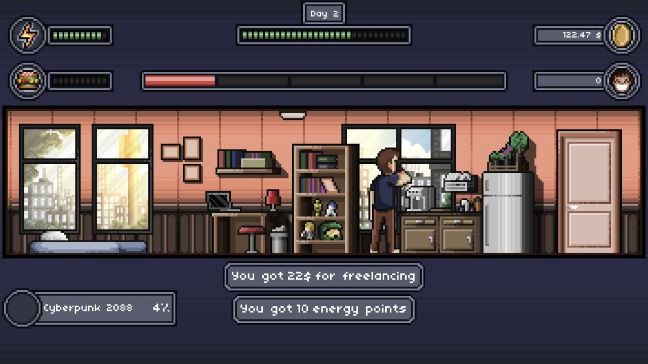 Indie Dev Simulator RUS v 0.2.2 Новая версия Полная версия Последняя Дата выхода 30 мая. 2020 Разработчик Egor Magurin, Shilov Жанр Симуляторы, Стратегии, Инди Смешанные на основе 70 обзоров в Steam 61% Обновлено 26 января 2025, 01:07 Список изменений В dev_me игрок берет на себя роль разработчика. Главный герой – парень в синей футболке с русыми волосами. Он начинающий программист, желающий стать успешным создателем программ и компьютерных игр. Для успеха необходимо научиться правильно распределять время, ведь для написания кода нужны часы ежедневной работы, но физиологические потребности тоже требуют времени. Нужно следить за показателями жажды, сна и голода, вовремя кормить персонажа и обеспечивать ежедневным сном. Начинается карьера в dev_me с создания двухмерной игры на спортивную тематику. Постепенно доход героя растет, но увеличиваются и расходы. На качественное питание и покупку новой техники нужно много денег. Он принимает решение создать собственный блог про геймдев, что тоже отнимает время, но приносит новых клиентов. Проживает айтишник в небольшой квартире в пиксельном стиле. В 1 комнате находится все необходимое для жизни – матрас на полу, книжный шкаф, стол с ноутбуком, небольшой холодильник и кофемашина. В верхней части экрана можно следить за запасом золотых монет и количеством фанатов. Накопив 500 монет, появляется возможность приобрести старый стационарный компьютер вместо слабого ноутбука. Чем лучше техника, тем меньше времени персонаж будет тратить на работу. Первые деньги есть возможность заработать на фрилансе. Герою предлагают написать фанфик, придумать концовку к повествованию, сделать анимацию к логотипу и записать звук. Скачать торрент Скриншоты Показать больше Видео из игры Скачать Indie Dev Simulator Тип релиза Лицензия (Таблетка: Не требуется) Версия v 0.2.2 (Полная) Последняя Размер 58 МБ Интерфейс Русский Озвучка Отсутствует Установка: Скачать .torrent торрент файл Скачать БЕЗ торрента прямая ссылка через uTorria Системные требования ОС: 7, 8, 10 (64-bit) Процессор: 2,5 GHz+ Оперативная память: 1024 МБ Видеокарта: 512МБ Место на диске: 200 МБ