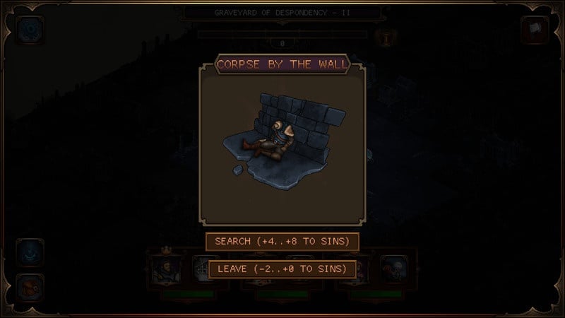 Уровни всегда генерируются рандомно. В режиме исследования на пути помимо сундуков, врагов и ловушек часто встречаются мешки, трупы, склепы и могилы. Игра всегда предлагает их грабить ради возможного лута (присутствует возможность отказаться). Мародерство имеет последствия. Во-первых, можно спровоцировать появление группы мобов. Во-вторых, такие занятия повышают шкалу грешности. После её заполнения все местные противники становятся сильнее. Грех-о-мётр и растет при выполнении связанных с боссами действий. К примеру, в логове владыки Обжорства пополнять здоровье лучше целебными баночками, а не едой.