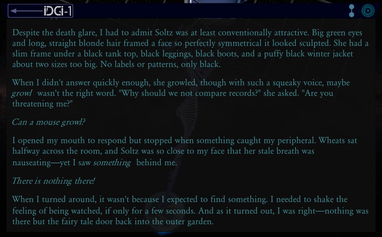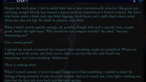 Технически Whispers From The Rift является визуальной новеллой. Здесь очень много текста. Картинок тоже хватает, однако большая часть описания представлена в виде слов (коих здесь более 400000). Тут предстоит часто делать выбор и наблюдать за последствиями. Если развитие истории не понравится, то можно отмотать время назад и попробовать другие варианты. У проекта более сотни концовок – от счастливых до трагичных. Адвенчура использует около 100 глобальных переменных для выстраивания нелинейности.