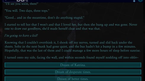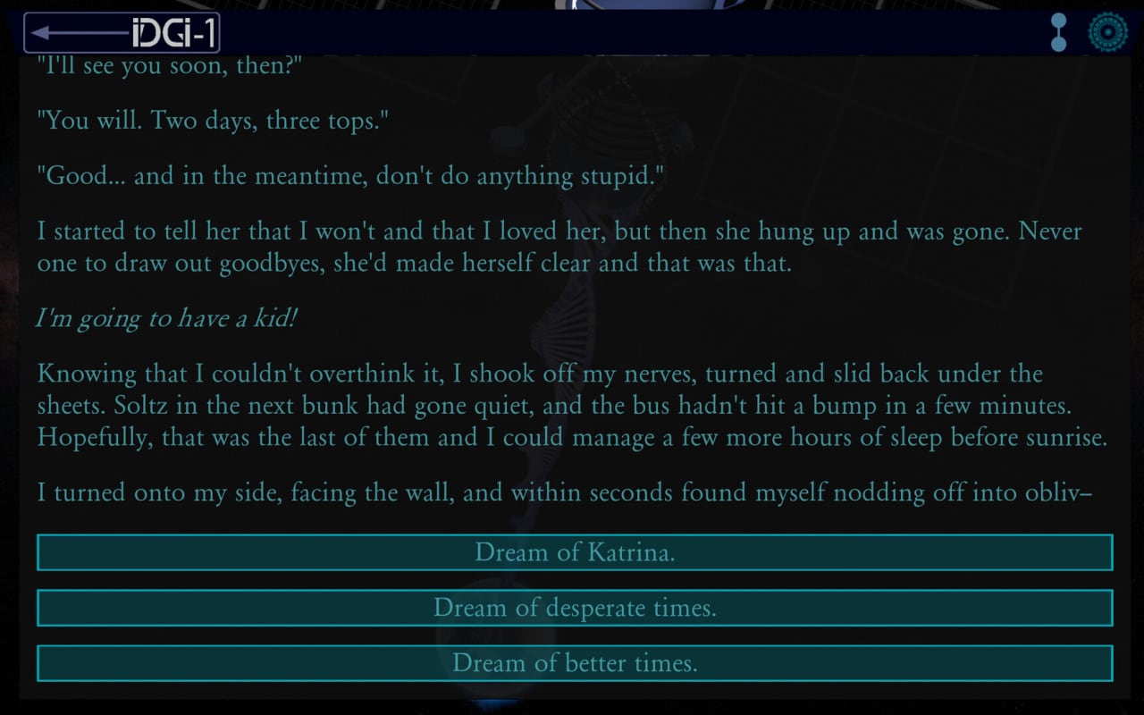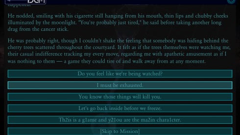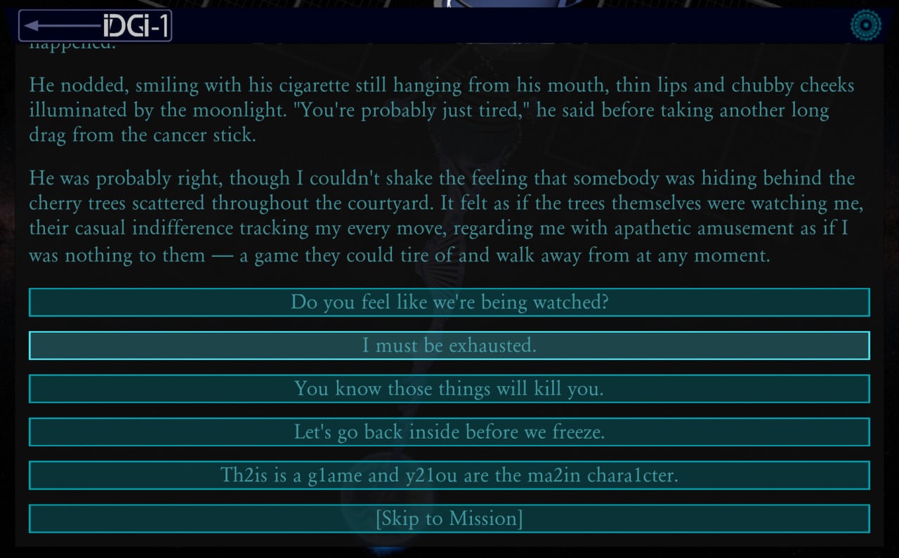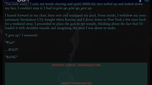 Здесь закрученный научно-фантастический сюжет с твистами и разрушениями четвертой стены. Сам спецназовец постепенно начинает чувствовать присутствие в своем мозгу какого-то другого существа и осознавать что-то неладное. У пользователя будет возможность помочь бойцу с непростой судьбой выполнить главную задачу или помешать его планам.