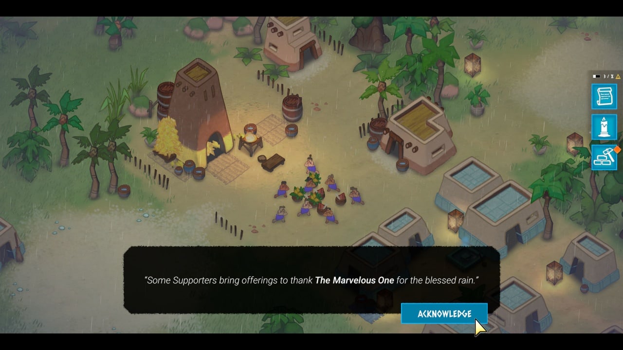 Сначала в маленьком палаточном городке есть только костер, а затем инфраструктура разрастается, обзаведясь храмами и рынками. Также можно ставить статуи и чудеса, повышающие здоровье, вдохновение и другие параметры жителей. Для улучшения строений нужно провести обряды.