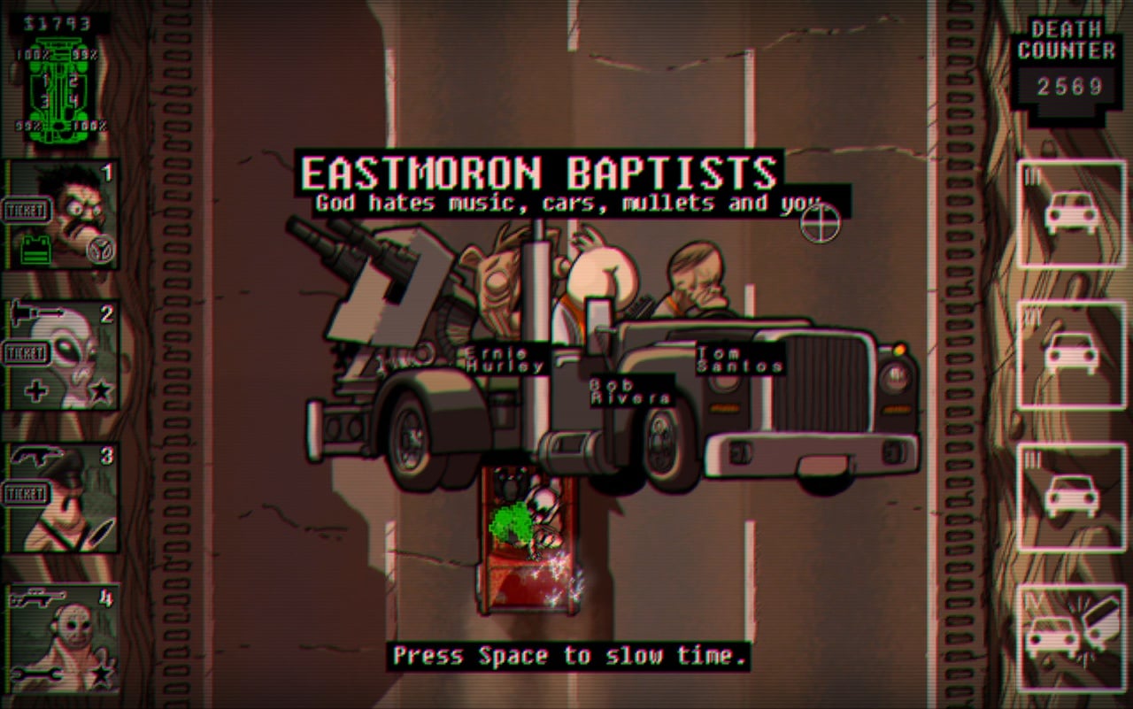Игру можно проходить много раз из-за ряда особенностей. Рандомная генерация уровней постоянно подкидывает новые приключения. Есть несколько возможных финалов путешествия, включая вариант, где Марк становится мессией. Вдобавок, за одно прохождение вряд ли удастся открыть полную коллекцию снаряжения и машин. Вначале доступна только одна тачка без оружия, а всего можно разблокировать до 30 автомобилей. В боевую технику влезает разное количество человек – до 4 спутников. От типа транспорта напрямую зависит тактика на поле боя. На дороге нет правил – в ход идут циркулярные пилы, пулеметы, ракетницы и другие орудия убийства.