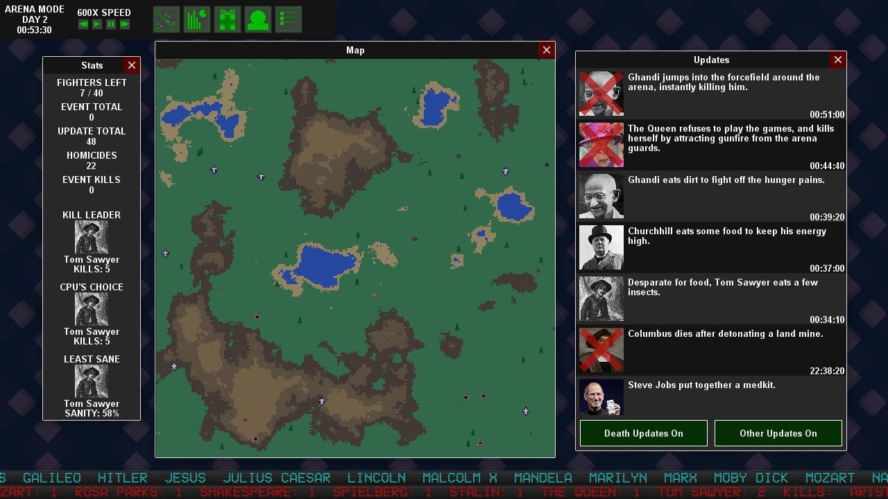 При этом оригинальная библиотека включает в себя множество заготовленных персонажей, среди которых Дональд Трамп, Канье Вест, Моби Дик и множество других знаменитостей. Можно поместить человечков на поле боя и наблюдать за их поведением, предоставив болванчикам самим вести поединок. Либо же можно в любой момент включиться в сражение и вести свою армию вручную, задавая им порядок действия и выстраивая стратегию против противника. Юнитов можно кормить, взрывать, выдавать ящики с ресурсами или убивать на месте.
