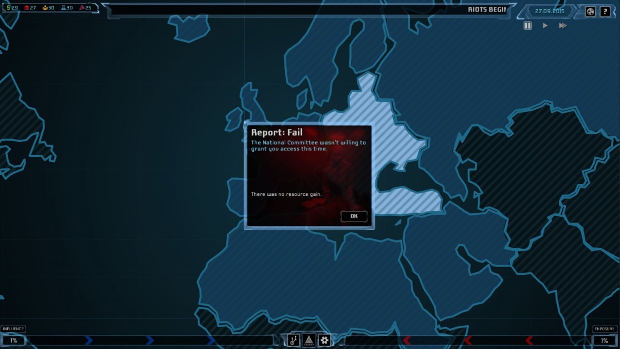 В каждой области необходимо проводить операции, отправляя агентов на задания. Подопечные способны дестабилизировать ситуацию и снизить чужой авторитет. Иногда миссии заканчиваются неудачами. Присутствует возможность заручиться поддержкой союзников. Еще тут есть древо прокачки. Там открываются новые скиллы, чью процентную эффективность можно улучшать.