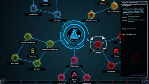 Периодически неизвестная сторона будет пытаться разоблачить организацию. Чтобы этого избежать, следует временно залечь на дно. Кроме этого умения есть и другие навыки. Способности позволяют увеличить влияние в регионах по всем аспектам одновременно, ускорить получение ресурсов и т. п. Однако эти скиллы долго перезаряжаются.