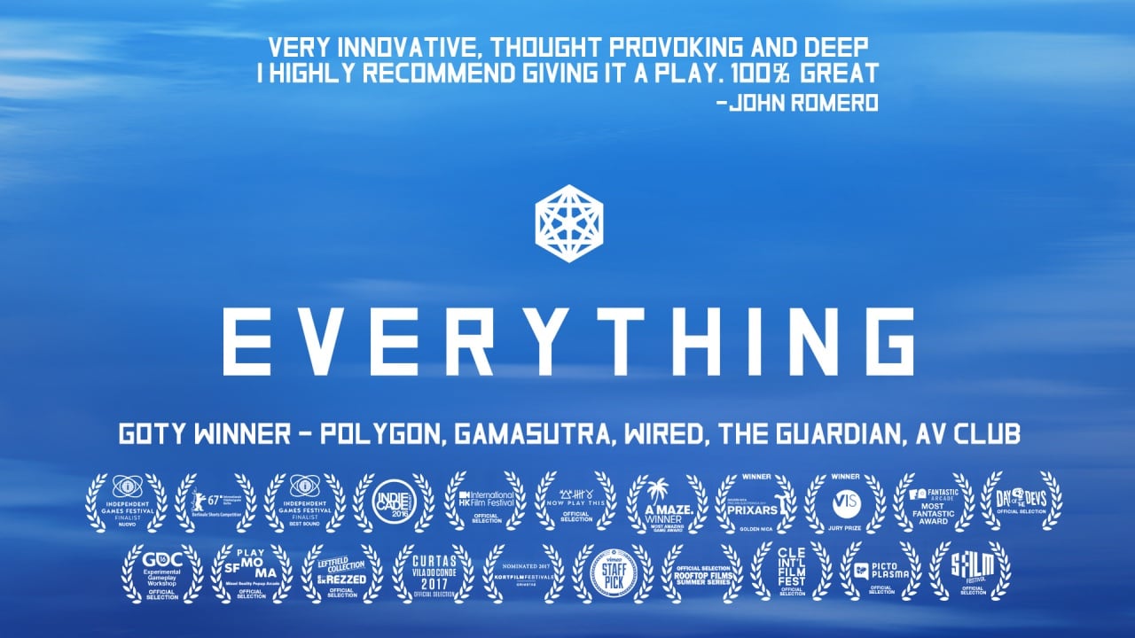 Everything не обладает традиционным геймплеем. В её названии уже скрыт смысл игры – в ней можно быть всем и наблюдать всё. Это не песочница, скорее, интерактивное кино, в котором нет как таковой сюжетной линии, но в котором можно жить. В ней можно быть бактерией или сверхновой звездой, школьным автобусом или камнем, прочувствовать, что в этой сюрреалистической вселенной душа есть у всего, даже неживого.