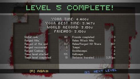 В Beeftacular около 100 официальных уровней. Они открываются постепенно. В конце забега подсчитывается общее время, пройденная дистанция (в пикселях), количество убийств и комбо, число простых и обычных прыжков, а также отскоков. На основе этой информации юзеру выдают глобальный ранг. Есть редактор и пользовательские карты. Для кампании можно выбрать сложность – от нубской до опытной. Для спидраннеров разработчики создали отдельный режим.