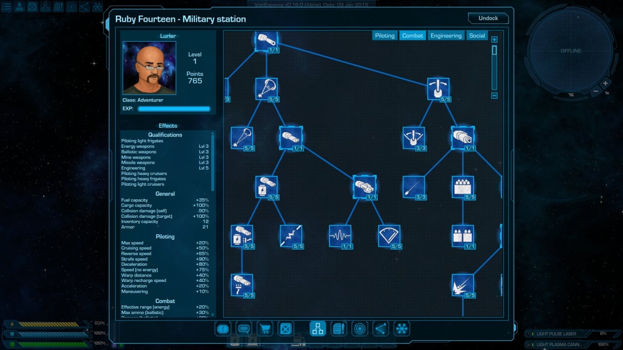 У протагониста есть 4 навыка: ведение боя, социальное взаимодействие, инженерия и пилотирование. Их можно прокачивать. Выбор класса (торговец, пират, боец и т. п.) влияет только на изначальный уровень этих умений. Дерево навыков у всех семерых одинаковое. Редактор позволяет подобрать внешность герою по вкусу. Присутствует выбор пола.