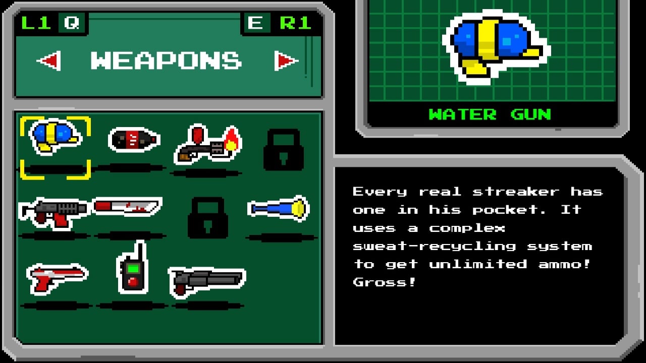 Crazy Pixel Streaker – инди-экшен с изометрической камерой, использующий спортивную тематику для построение сумасшедших уровней, на которых происходит форменное безумие с некой долей насилия и некоторым количеством крови, разлетающейся на всю территорию арены. Поддерживается управление с помощью контроллера, что позволяет позвать компанию друзей для кооперативного веселья. В нём участвуют одновременно до 4 человек и противостоят друг другу как в последний раз. Также, можно искать соперников благодаря интернету, набирать наивысшие финальные счета и попадать в таблицу лидеров, отображающая успех всех пользователей.