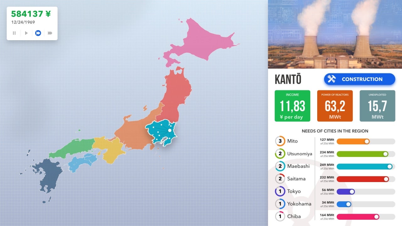 Помимо геймера, будут и другие конкуренты, также занимающиеся энергетикой. Потребуется стать лидером в данной отрасли и добиться принятия от государства. В стране имеется только 8 областей, где строятся станции. За внутриигровую валюту, добытую при помощи добычи энергии, создаются АЭС и производятся модернизации. Мегаполисам постепенно необходимо использовать больше энергии. Улучшение реакторов, конструирование новых элементов и правильный баланс стоимости услуг – лучший выбор, чтобы увеличить репутацию.